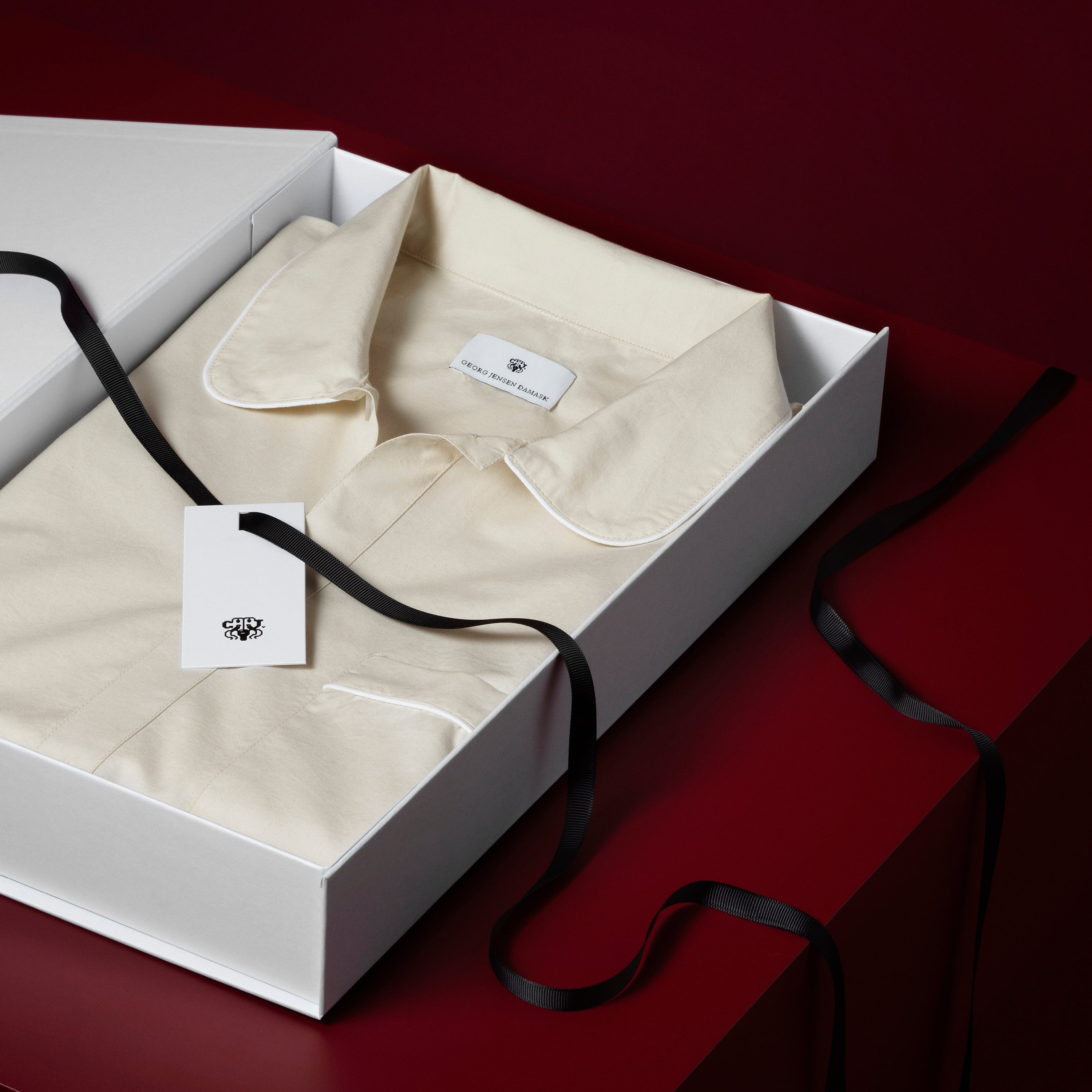 Percale-woven pyjamas with a classic cut and elegant details, such as side slits, breast pocket, rounded collar and white pipings.