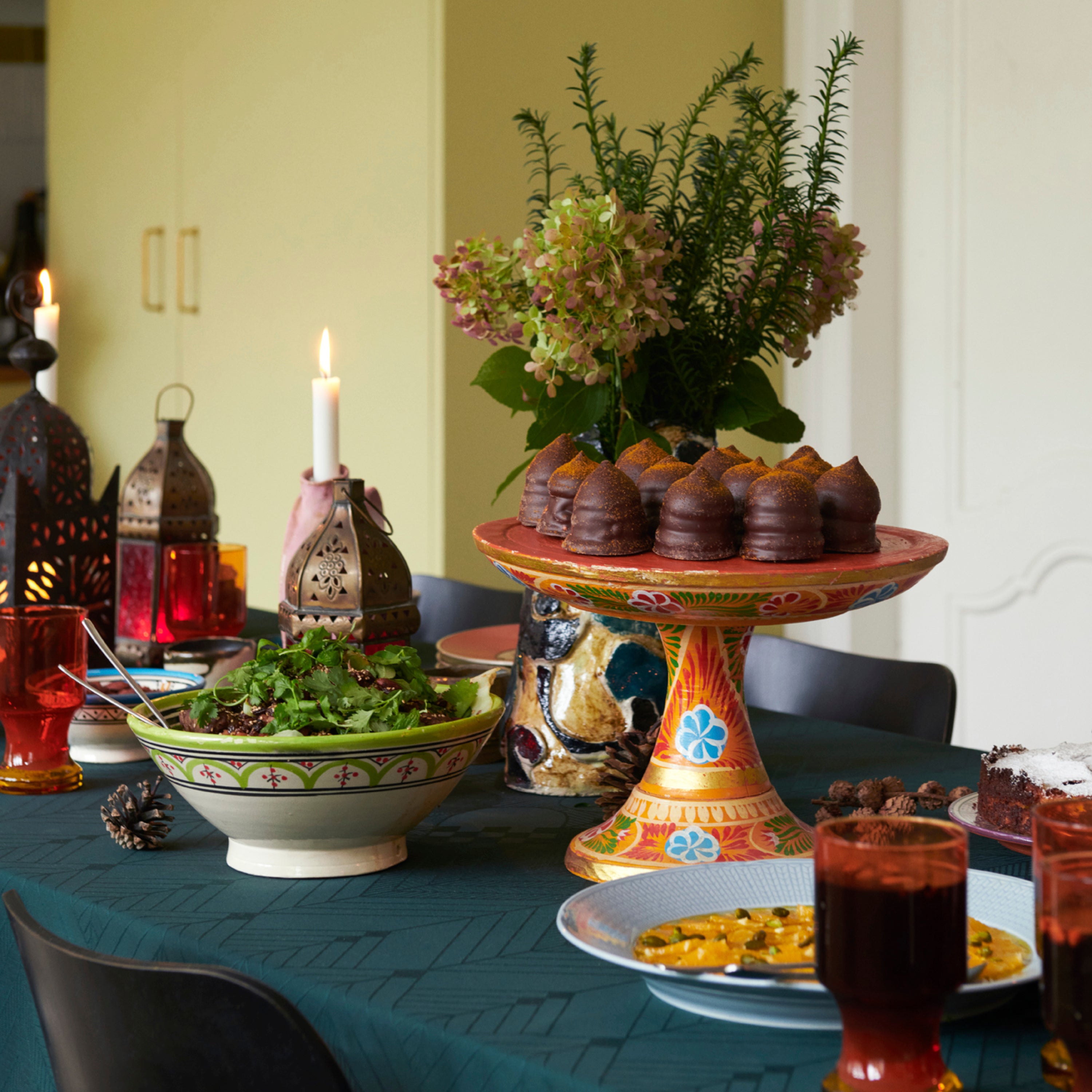 CMB: While Claus is in the kitchen, I set the table. It’s a fusion of traditional Middle Eastern style and Danish Christmas; eclectic, colourful and relaxed, with antique dinnerware and homemade ceramics. I love finding old Christmas decorations at flea markets. Christmas elves, small Danish flags and kitsch objects. I let myself indulge in nostalgia and max out on the decorations. Every year we create a Christmas scene in the dining room, too.