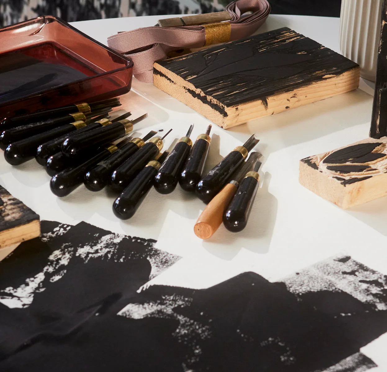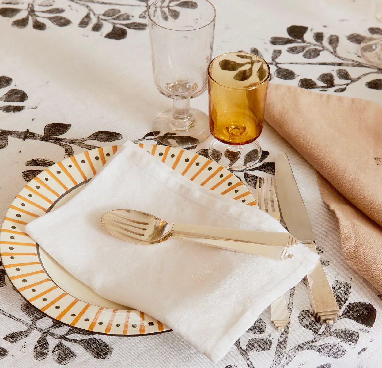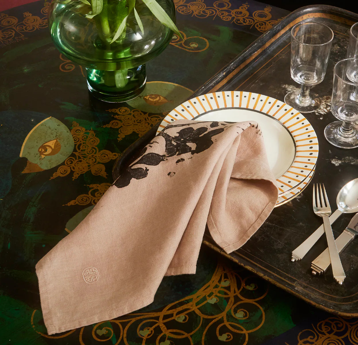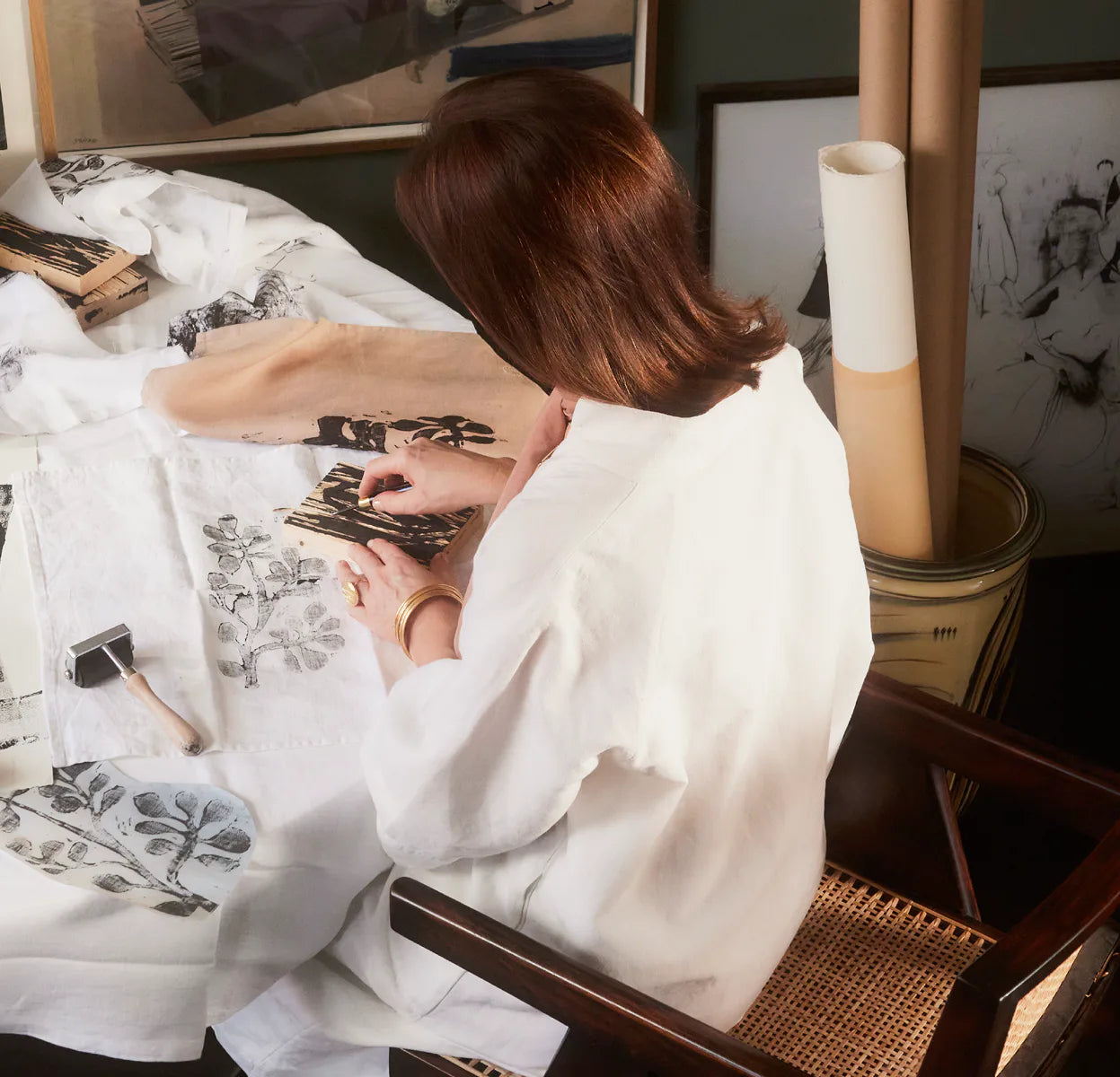 Printing the woodcuts onto textiles such as tablecloths and napkins has been an enjoyable process. I think it’s wonderful that what I have created has a place in everyday life. I like to surround myself with aesthetic details that add personality and originality to my home. Setting a table also reminds me of making a piece of jewellery, like a small artwork that strives for perfection. It’s the starting point for everything I do.