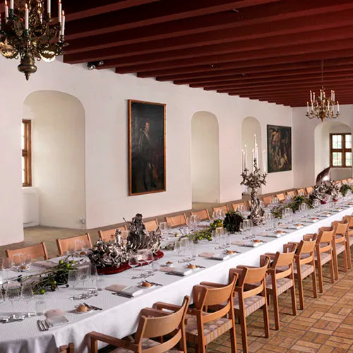 Image 5: In 2023, H.M. Queen Margrethe II celebrated becoming the longest-serving reigning monarch in Danish history with a dinner held in The Great Hall at Koldinghus. The tablecloth chosen for the event was the damask woven Snefnug. Photo: Keld Navntoft.