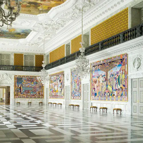 Image 8: The Great Hall at Christiansborg Palace, with Bjørn Nørgaard's tapestries and Georg Jensen Damask's wallpaper and furniture textiles. Photo: The Royal House.