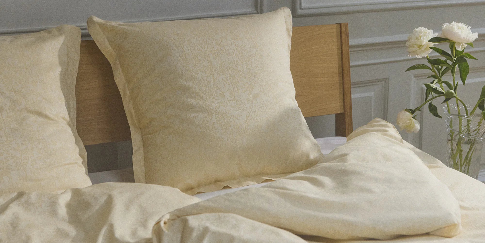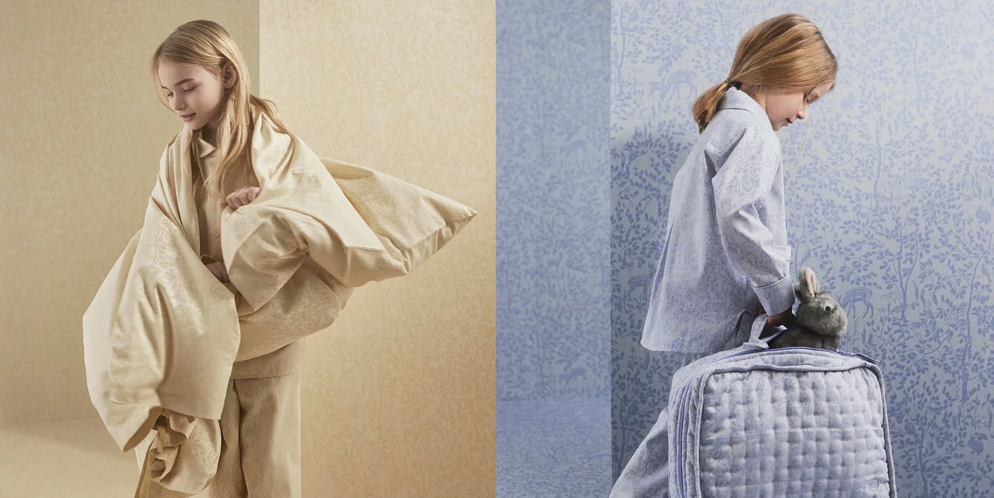 Tuck the kids into a woodland adventure. Georg Jensen Damask's Forest series features an elegant jacquard woven motif of deer, rabbits and birds frolicking among budding green trees. A design that is particularly appealing to children. The collection includes nightwear, bed linen, baby blankets and suitcases for the little ones.