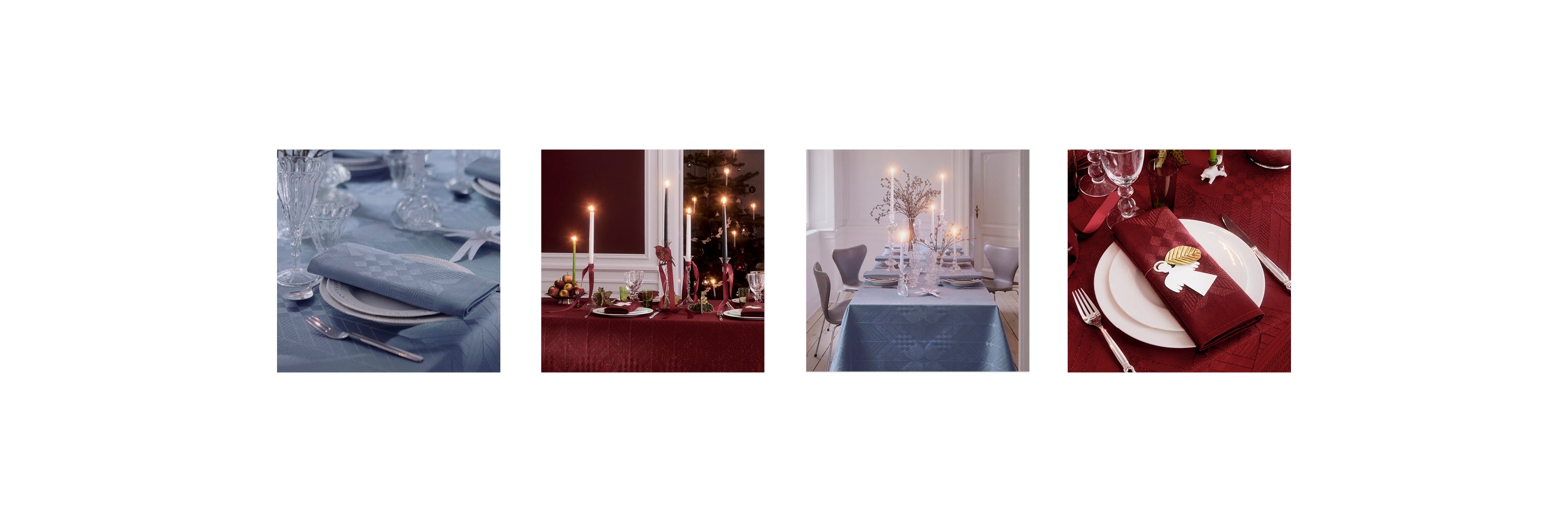 Christmas 50 juledugen og matchende servietter fås i to smukke farver, Gold Red og Silver Blue. Duge og servietter i både den dybrøde og den isblå variant er jacquardvævet i langfibret bomuld med funklende, metalliske tråde.