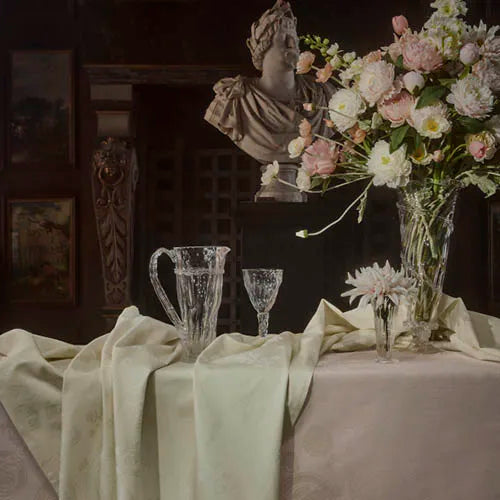 Når Christian 4. i 1620’erne inviterede til middag på Rosenborg Slot, krævede det en særlig pragtdug, der kunne være samlingspunkt for det gode måltid og den festlige stund. Dugen havde motiv af elementer fra renæssancemåltidet og ikke mindst et indvævet Christian 4.-monogram. Nu lancerer Georg Jensen Damask en moderne fortolkning af den historiske dug i farverne Pale Yellow og Soft Rose. Banquet-dugen er fotograferet på Rosenborg Slot.