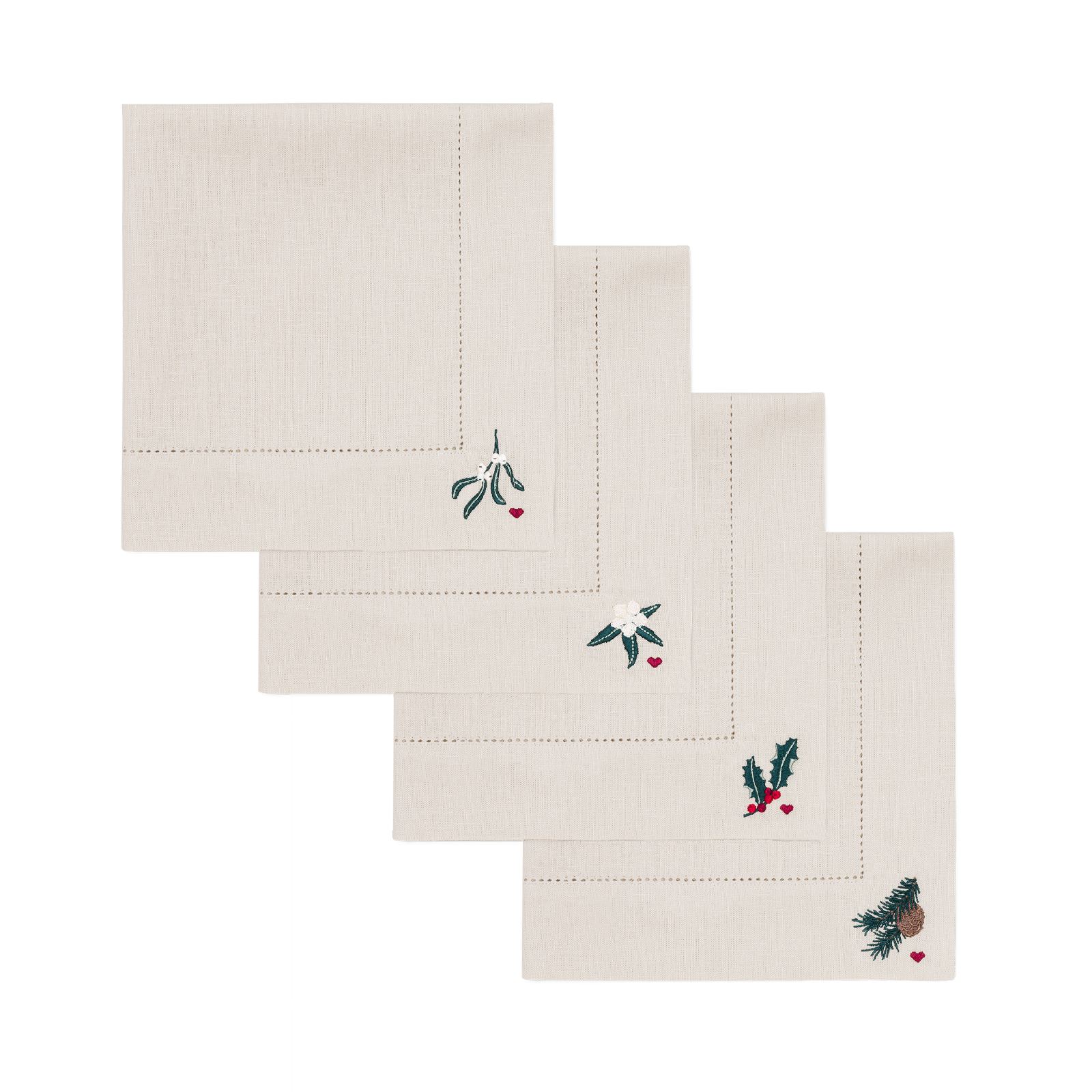 De naturfarvede servietter har hver et broderet motiv af enten en julerose, kristtorn, mistelten eller en grangren med kogle, der indrammes af en elegant bort med hulsøm.
