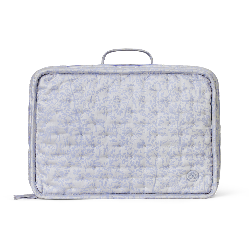 Motivet på Forest kollektionen er hentet fra en gobelin fra 1800-tallet fundet i Georg Jensen Damasks historiske arkiver. Forest sengetøjet er jaquardvævet i 100% bomuld med nyudsprungne træer, dådyr og kaniner indvævet i tekstilet. Det quiltet tæppe er blødt at lege på for de mindste. I kufferten kan de små have både legetøj og tøjdyr.