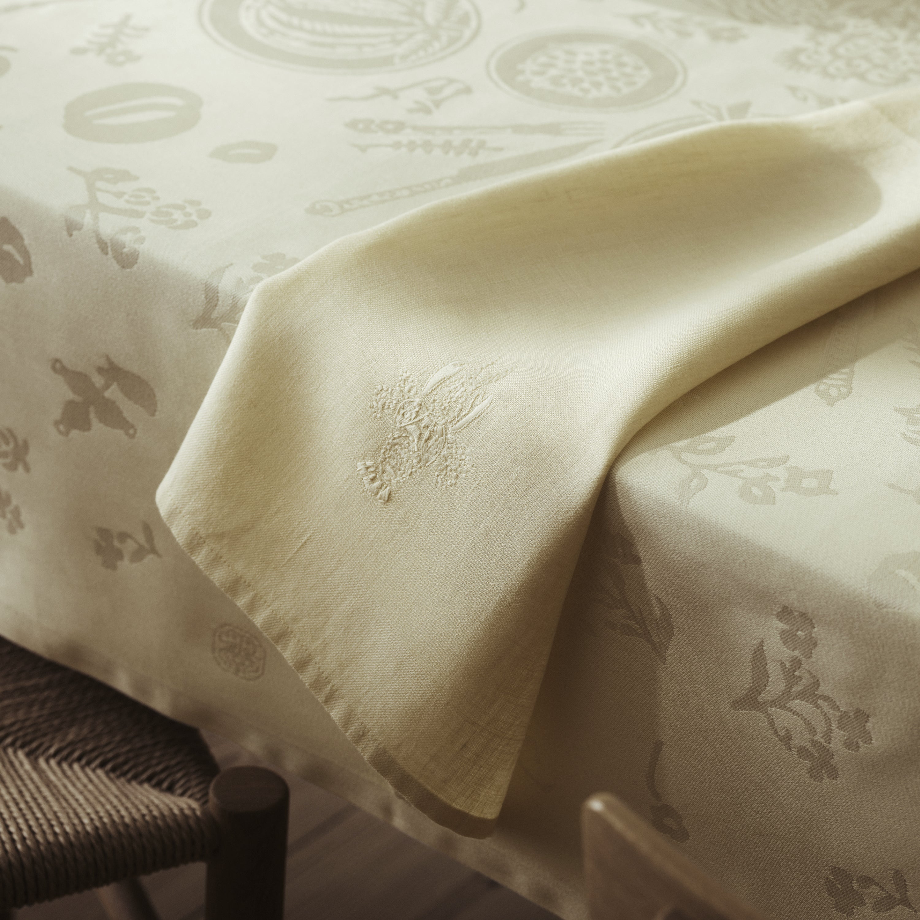 Banquet-serien er inspireret af Christian 4.s pragtdug. Når kongen i 1620’erne inviterede til middag på Rosenborg Slot, dækkede han det kongelige bord med en særlige pragtdug som samlingspunkt for den festlige stund og det gode måltid. Originaldugen, hvorfra motiverne er hentet, findes på Kongernes Samlings tekstilmagasin. Foruden servietter med broderet motiv i to nuancer indeholder Banquet-serien damaskdug og viskestykker.