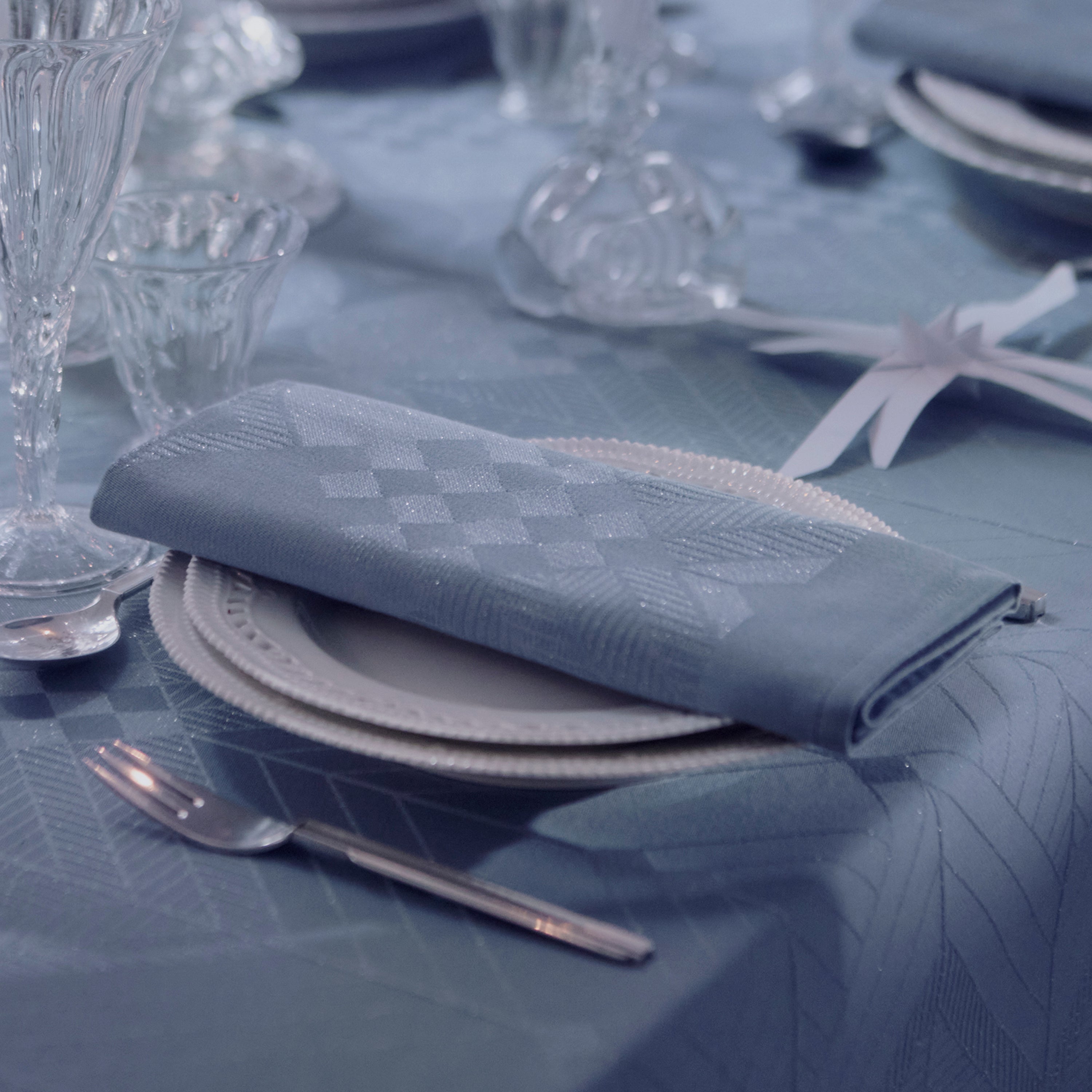 Georg Jensen Damask fejrer juledesignets 50-års jubilæum med et funklende præg på det ikoniske motiv. Den limiterede jubilæumsdug, Christmas 50, i farven Silver Blue er vævet i langfibret, isblå bomuld med sølvfarvede, metalliske tråde. En frostklar julebebuder.