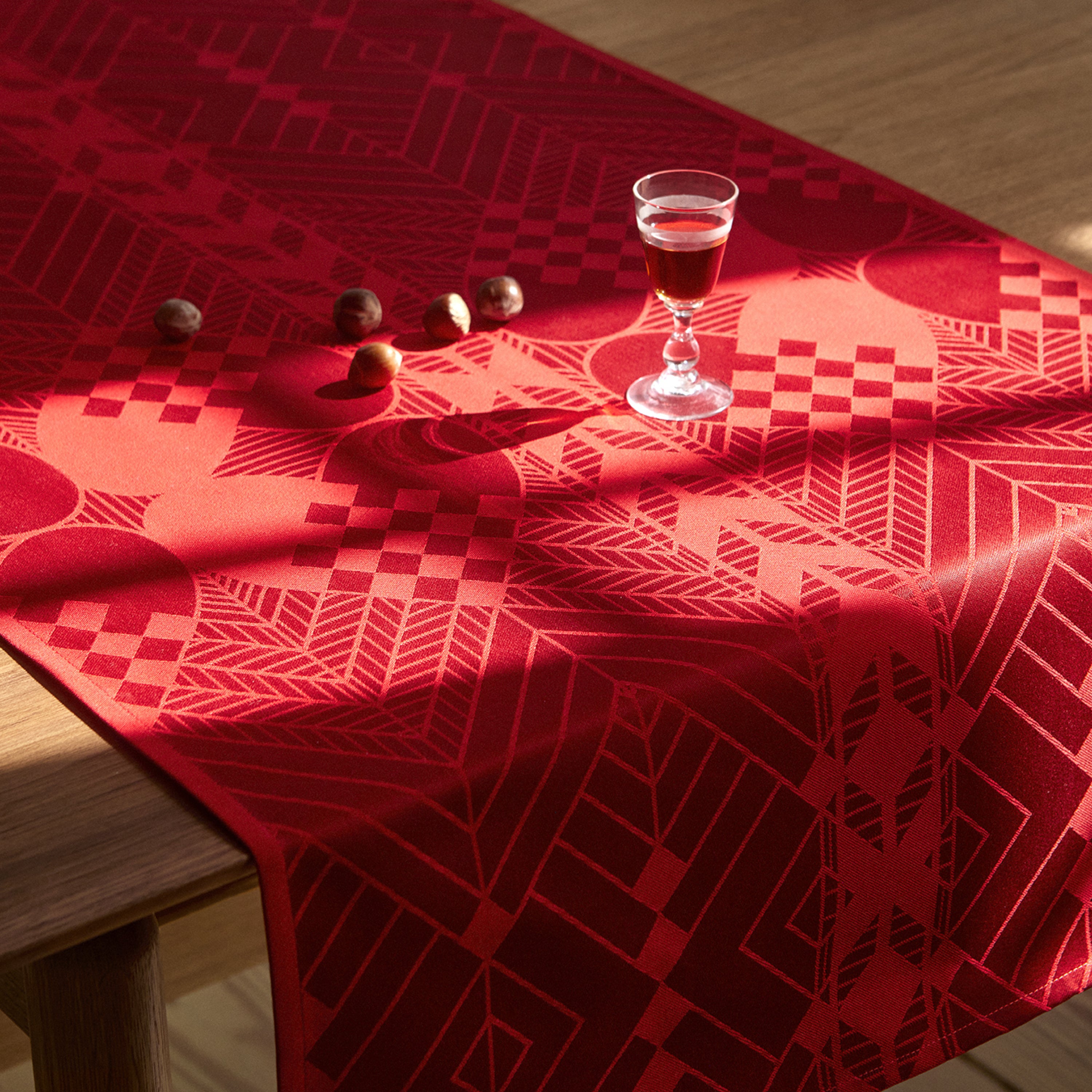 I den mørkerøde variant er to nuancer af julens ikoniske farve kombineret i vævningen, hvilket giver bordløberen en enkel, klassisk og stilfuld fremtoning. Matchende stofservietter fuldender udtrykket.