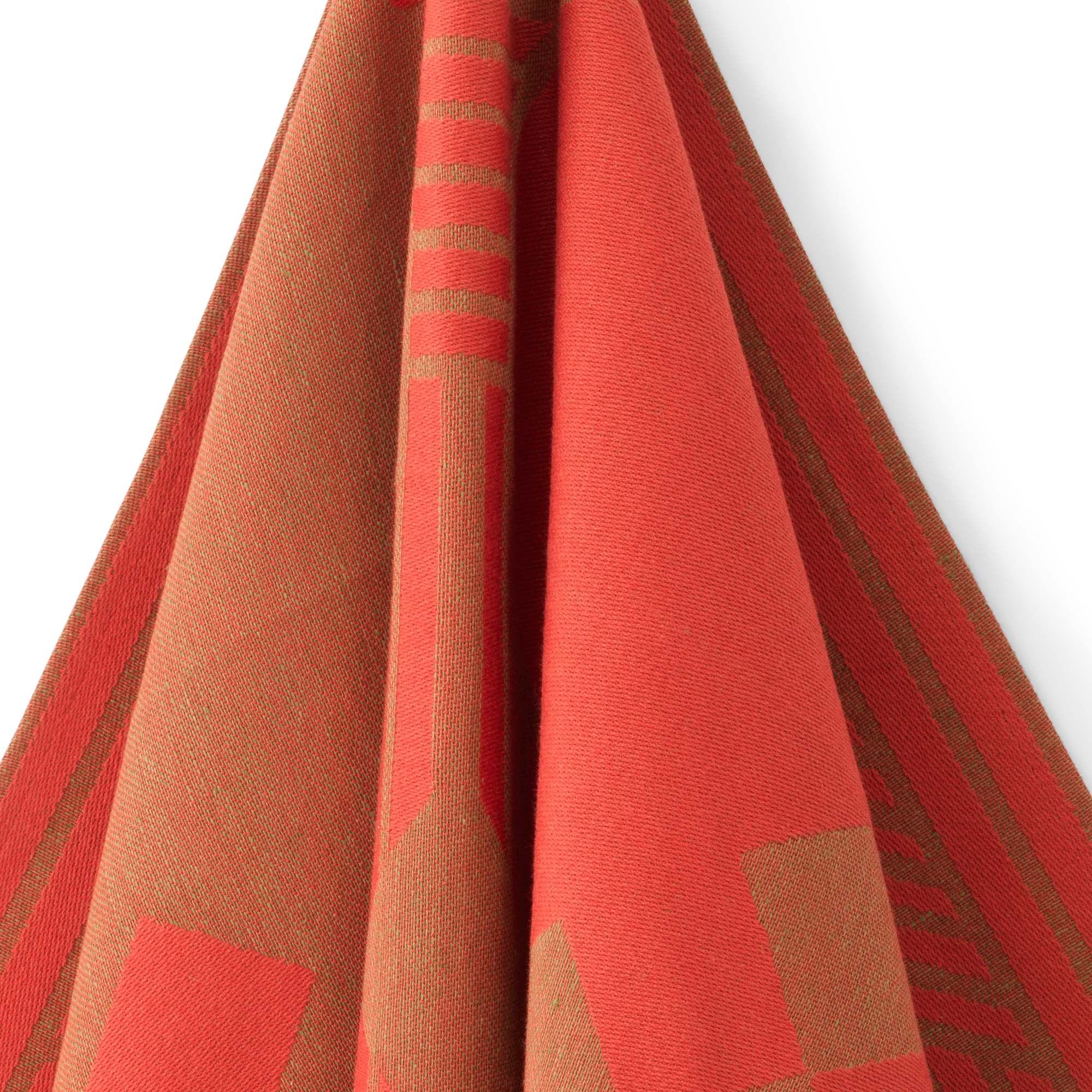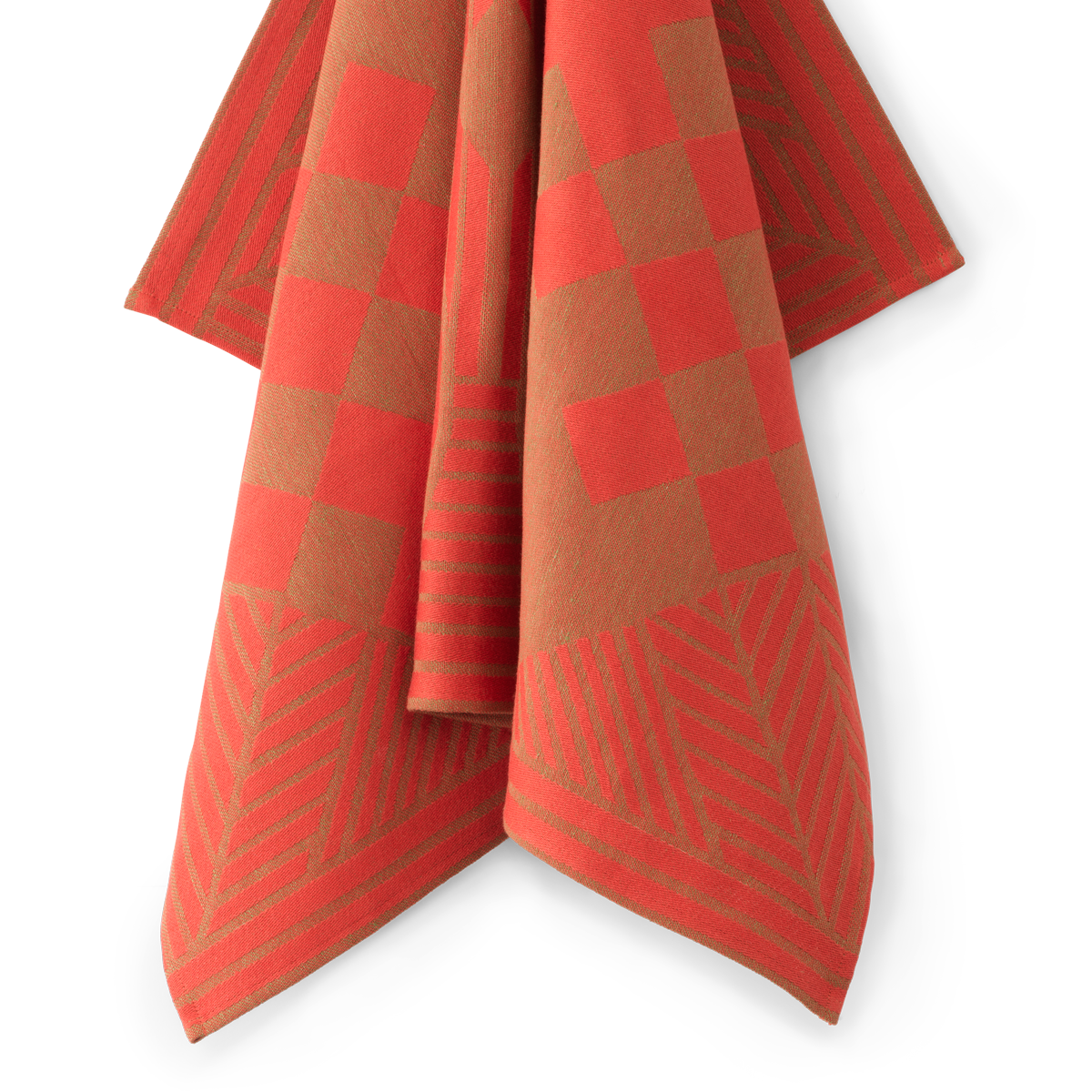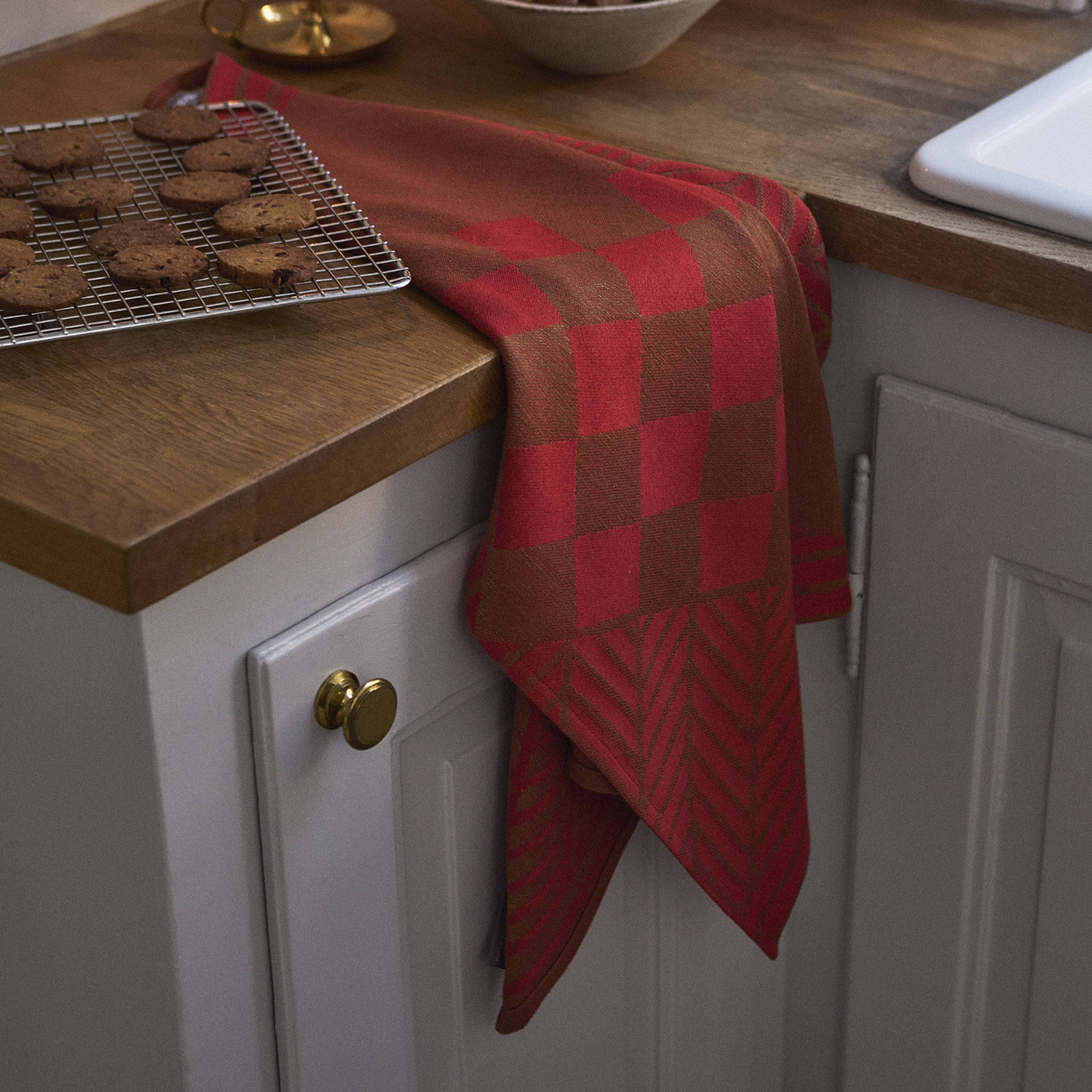 Christmas-viskestykkets klassiske julemotiv med flettede julehjerter og stiliserede grankviste bringer højtidsstemningen ud i køkkenet. Archive Red er en af de originale farver fra 1975. Den helt klassiske farvekombination i rød og guld. Kombinationen af hør og bomuld giver viskestykket en optimal sugeevne.