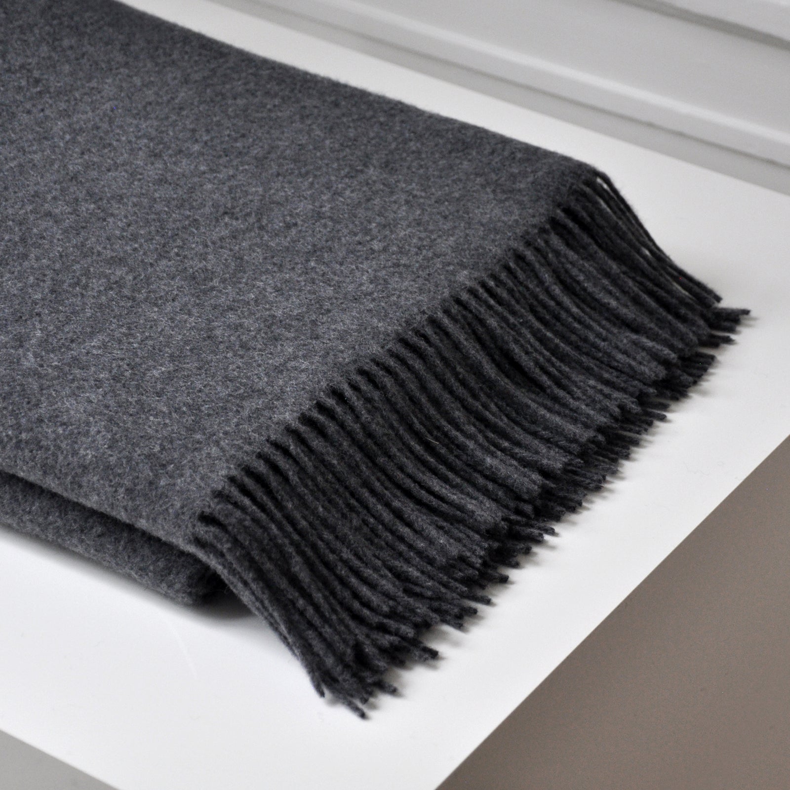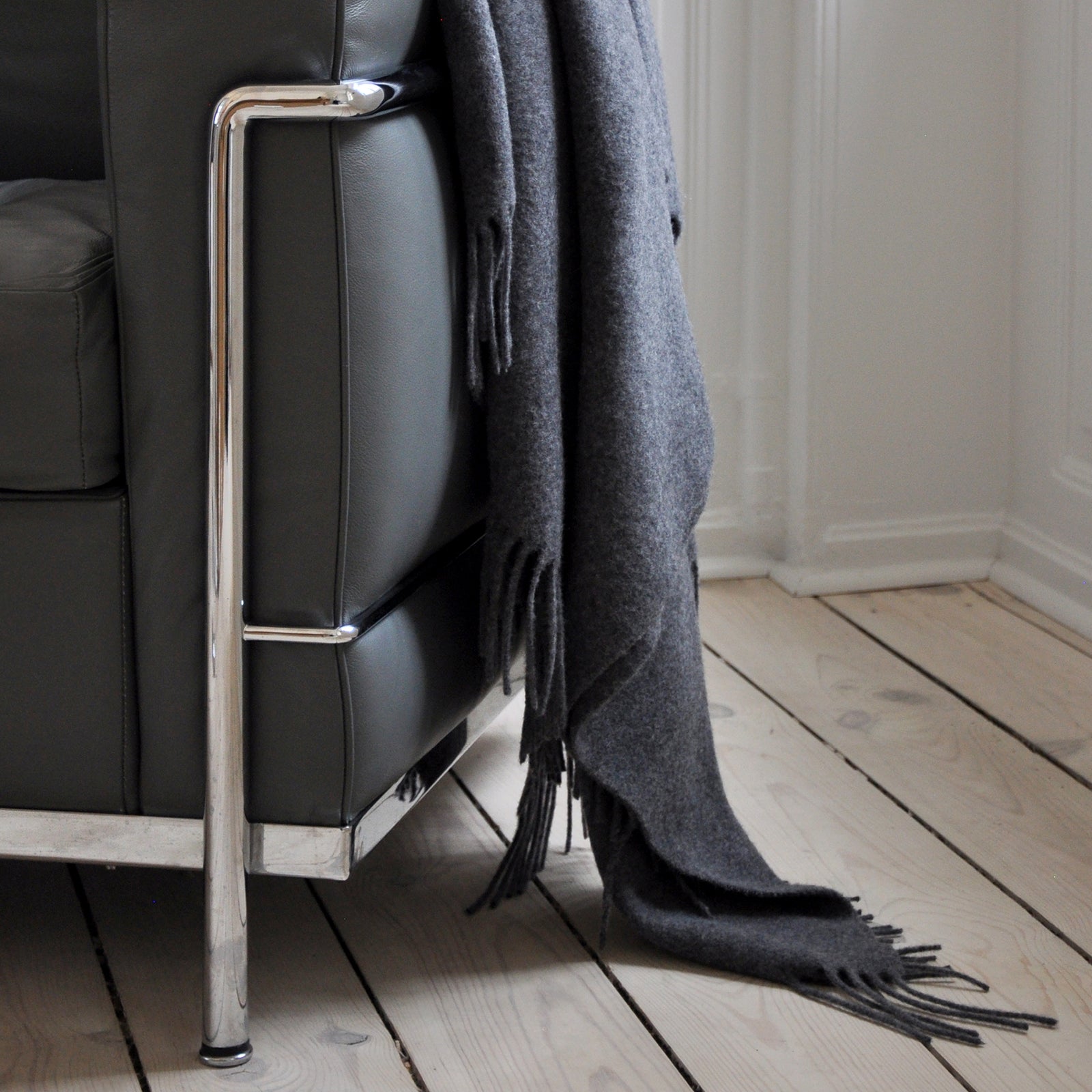 Clear har et elegant og enkelt design. Kombination af 90 % merinould og 10 % cashmere gør plaiden ekstra blød og uldens fine struktur tilføjer en særlig lethed. Plaiden er vævet i en mørkegrå farve og har lange frynser.