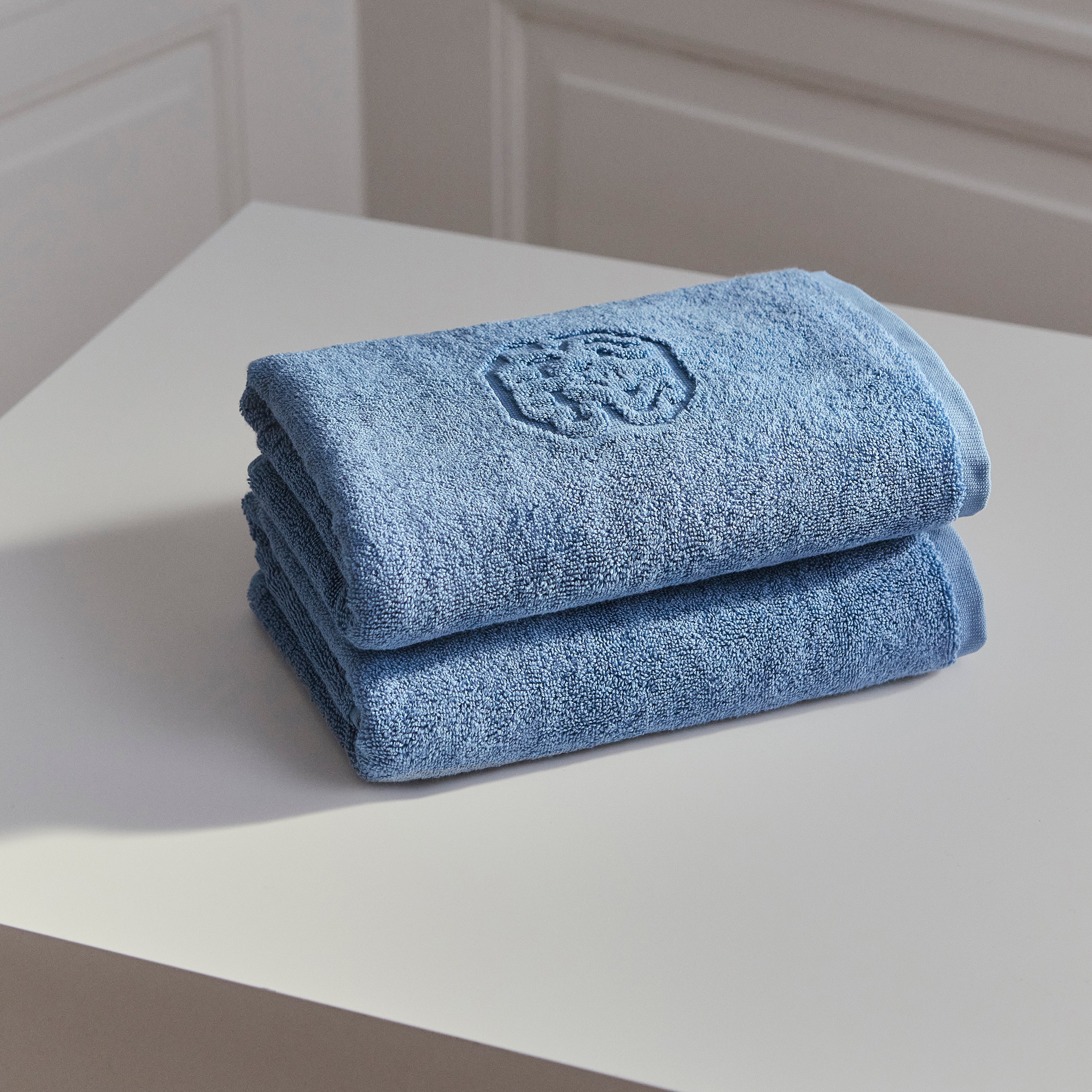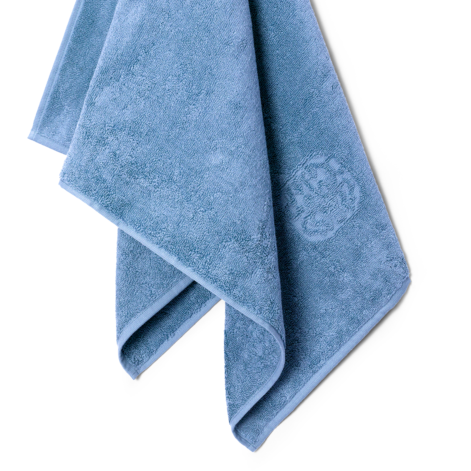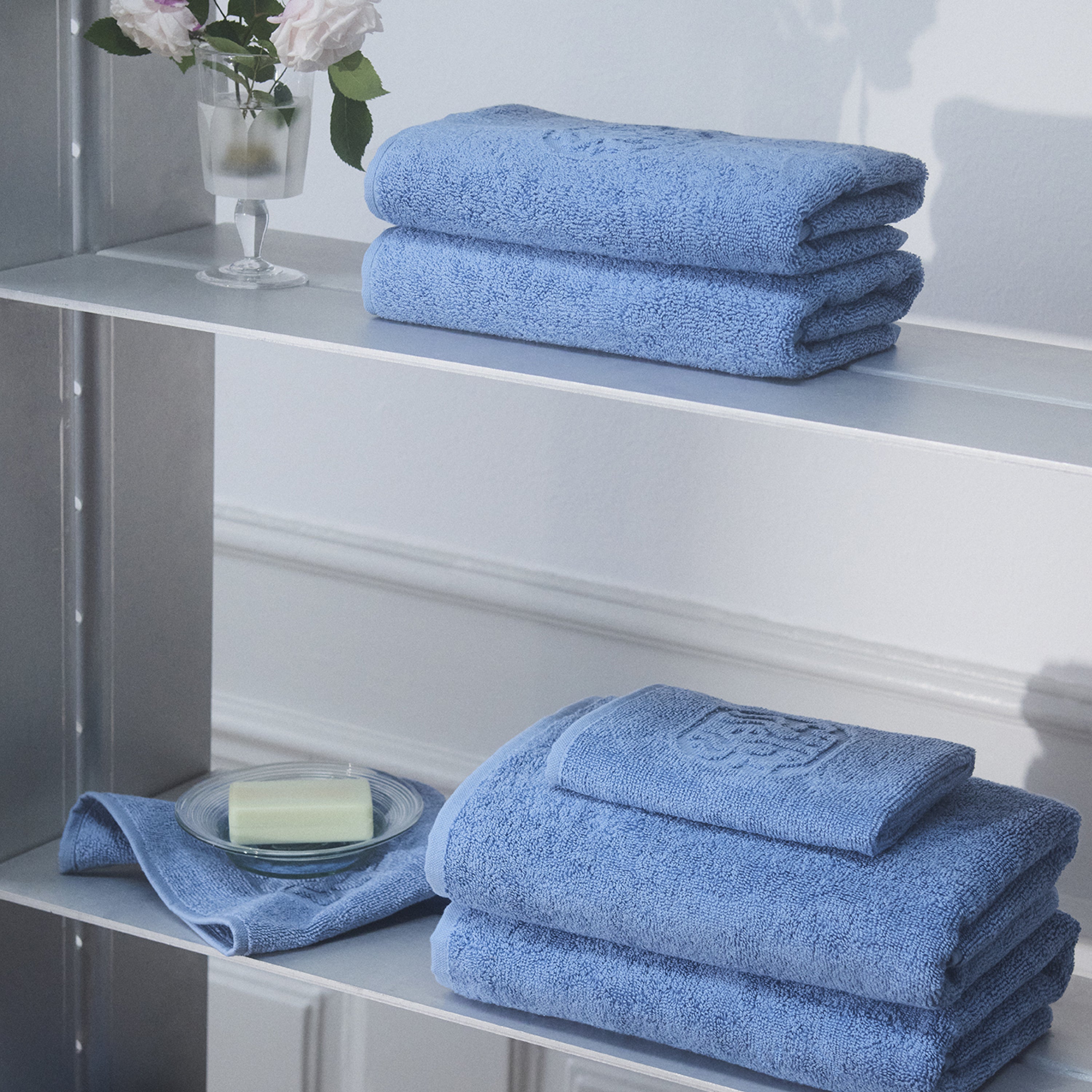 Det klassiske Damask Terry-håndklæde er frottévævet i 100 % dobbelttvundet, kæmmet bomuld. Det bløde håndklæde føles behageligt mod huden og bliver kun bedre, jo mere det bliver brugt. Farven Bright Blue er en klar blå nuance, der går på tværs af Damask Terry-serien.