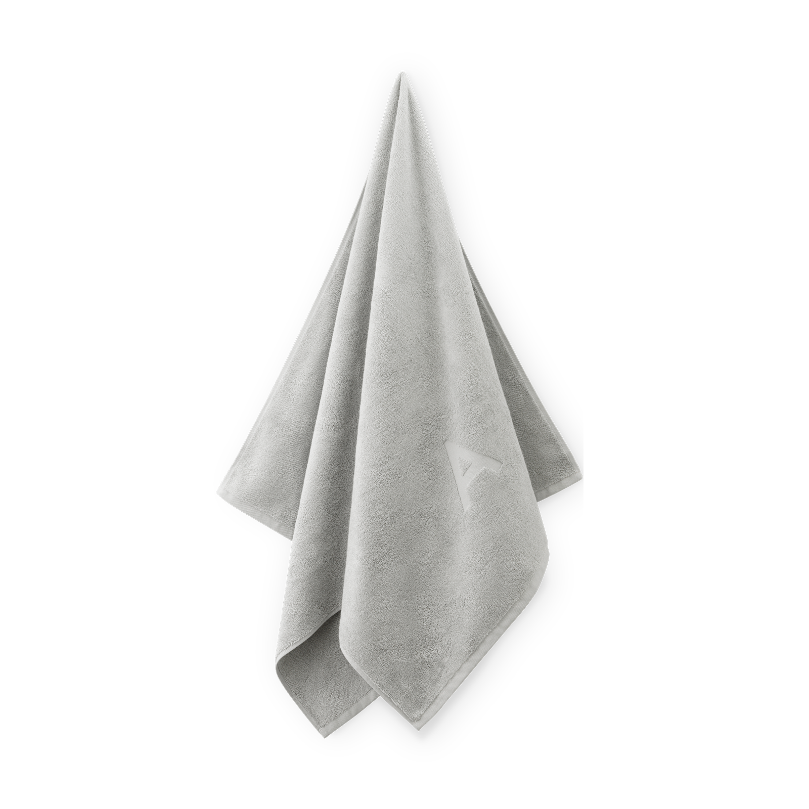 Damask Terry badehåndklæde med indvævet A bogstav. Badehåndklædet er jacquardvævet i 100 % dobbelttvundet, kæmmet bomuld med bogstav i relief. Det er både blødt, glansfuldt og slidstærkt. Den elegante farve, Platinum Grey, er en let og kølig nuance af grå.