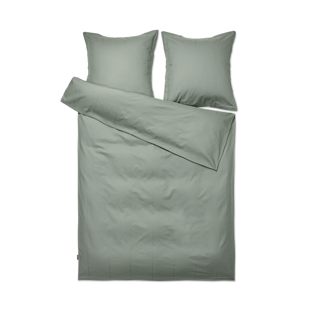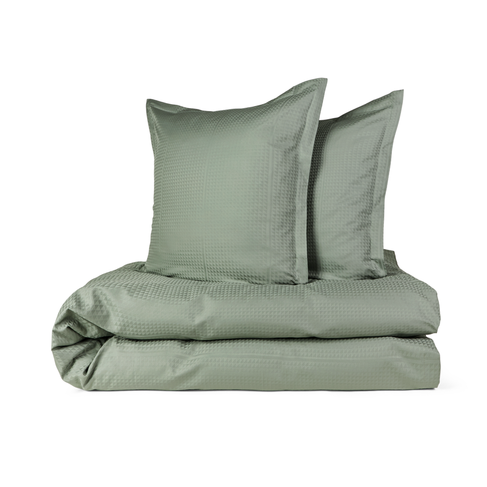 Georg Jensen Damasks Facet sengetøj har et stringent design og er damaskvævet i 100 % kæmmet bomuld, som giver en blød og glat overflade. Med Facet designet benytter tekstilkunstner Jette Nevers den klassiske damaskvævning til at skabe et elegant skyggespil, der smukt fremhæves i den mørkegrønne farve Mineral Green.
