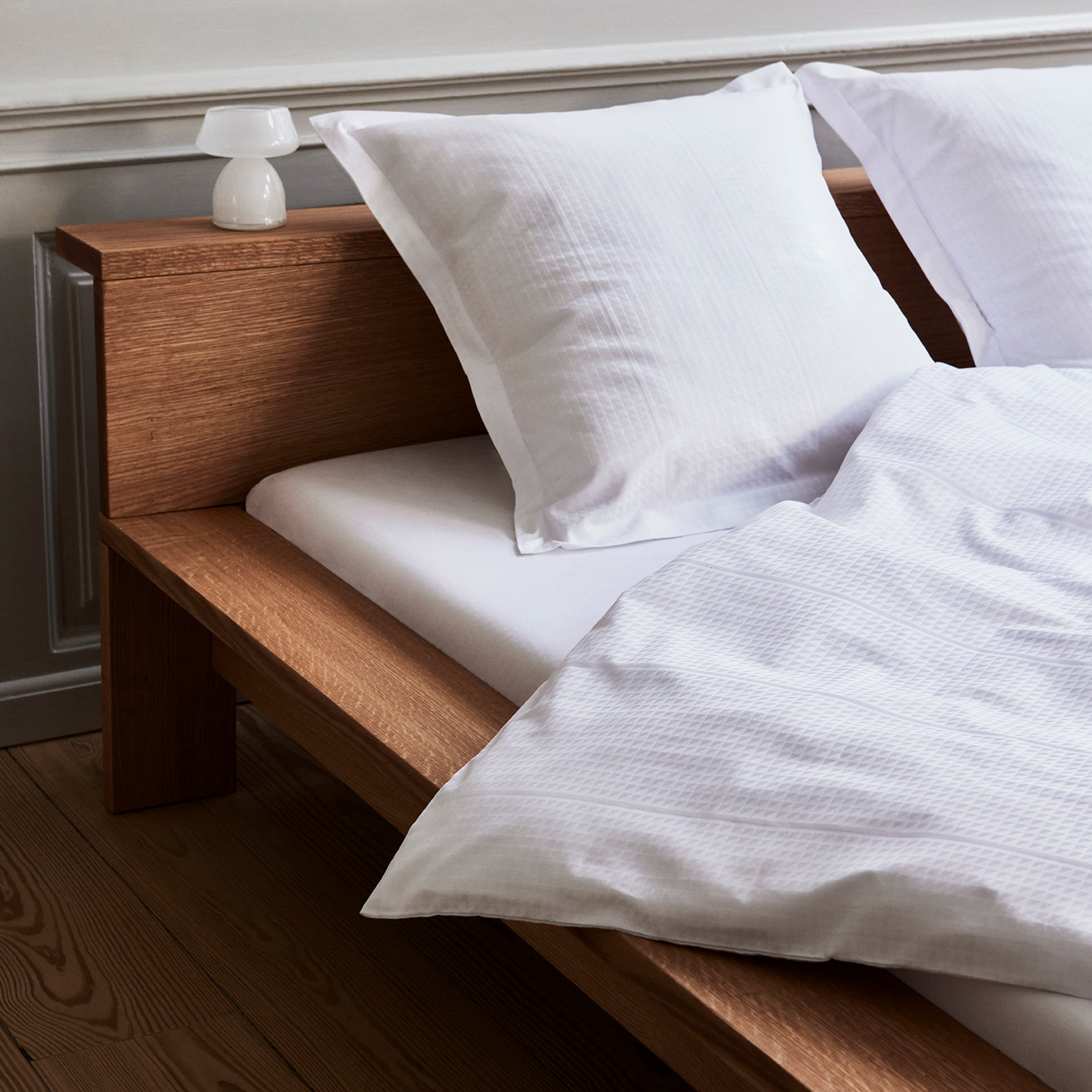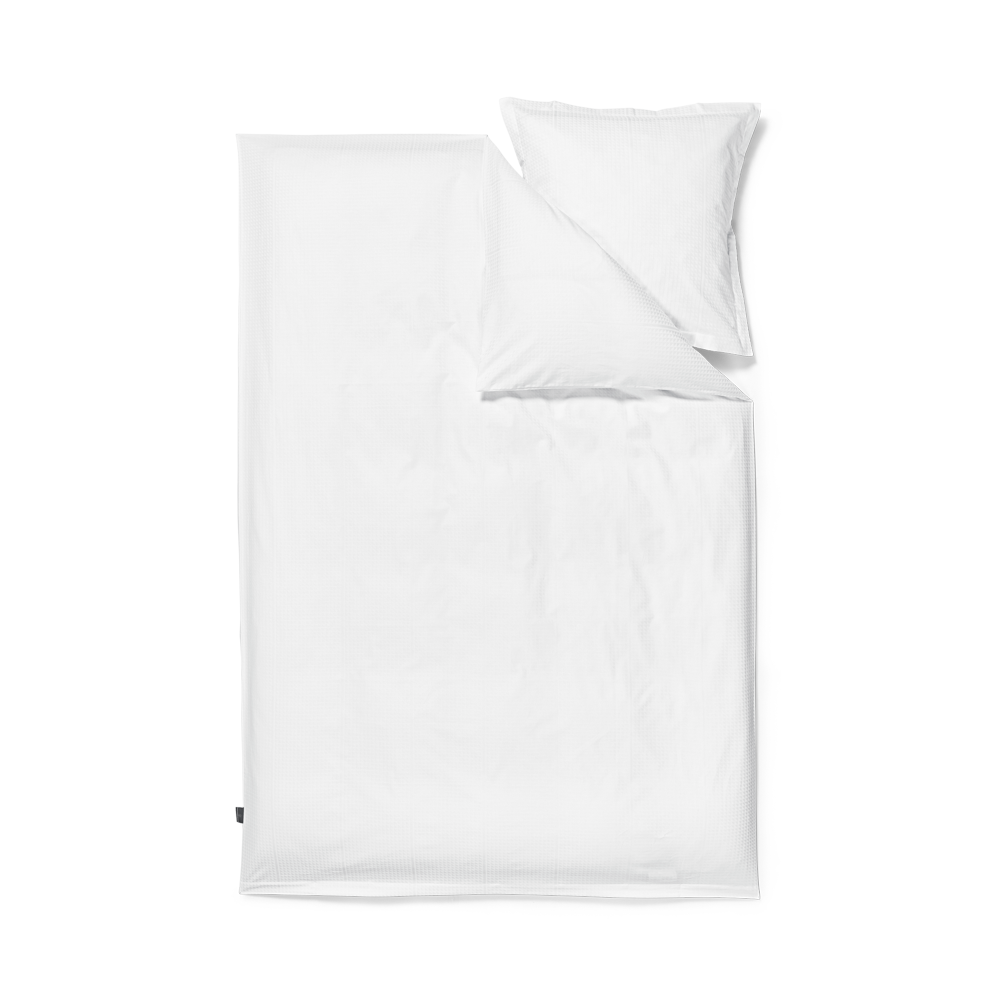 Georg Jensen Damasks Facet sengetøj har et stringent design og er damaskvævet i 100 % kæmmet bomuld, som giver en blød og glat overflade. Med Facet designet benytter tekstilkunstner Jette Nevers den klassiske damaskvævning til at skabe et elegant skyggespil.