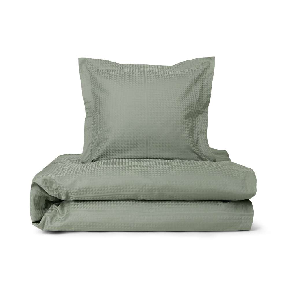 Georg Jensen Damasks Facet sengetøjet til familiens yngste har et stringent design og er damaskvævet i 100 % kæmmet bomuld, som giver en blød og glat overflade. Med Facet designet benytter tekstilkunstner Jette Nevers den klassiske damaskvævning til at skabe et elegant skyggespil, der smukt fremhæves i den mørkegrønne farve Mineral Green.