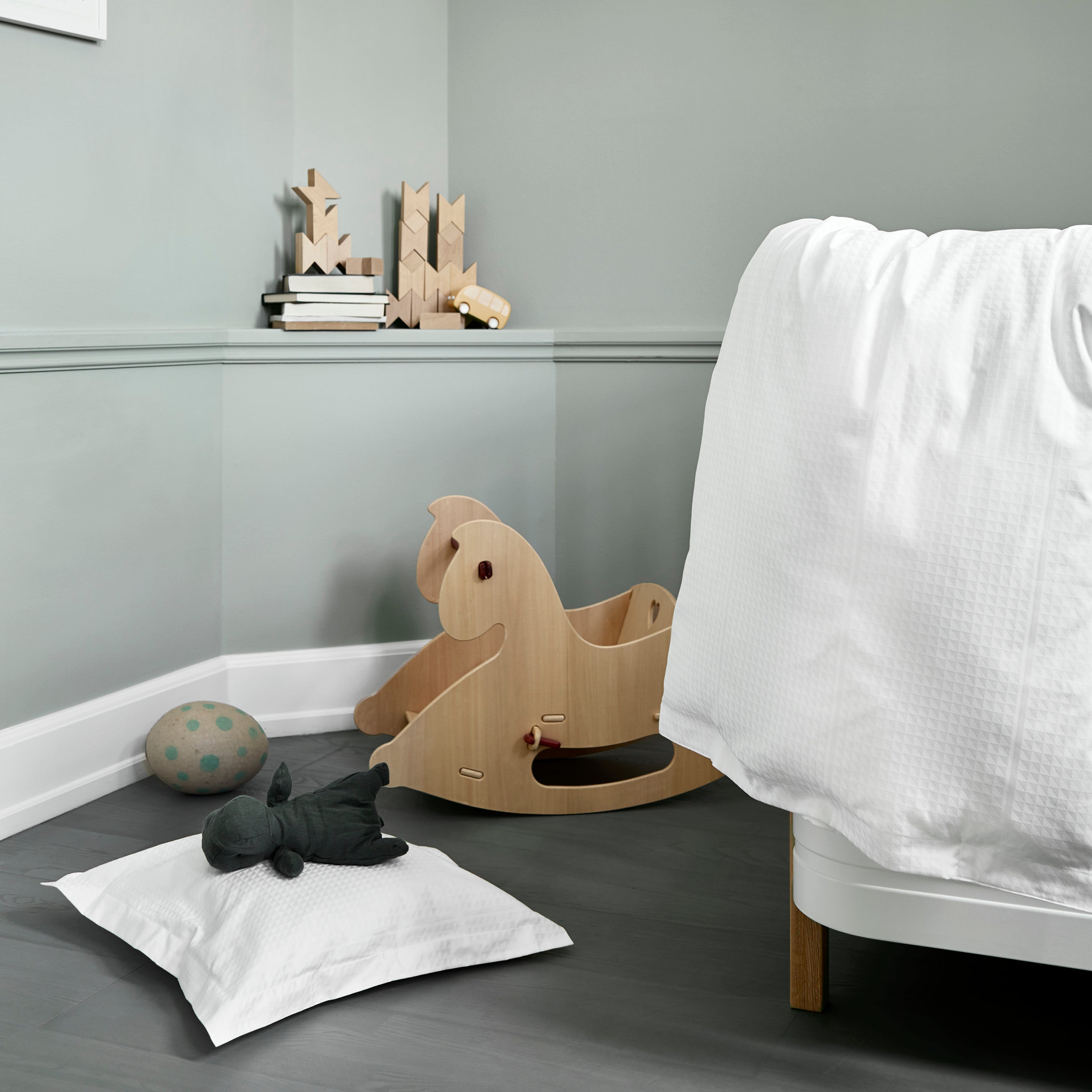 Georg Jensen Damasks Facet sengetøjet til familiens yngste har et stringent design og er damaskvævet i 100 % kæmmet bomuld, som giver en blød og glat overflade. Med Facet designet benytter tekstilkunstner Jette Nevers den klassiske damaskvævning til at skabe et elegant skyggespil.