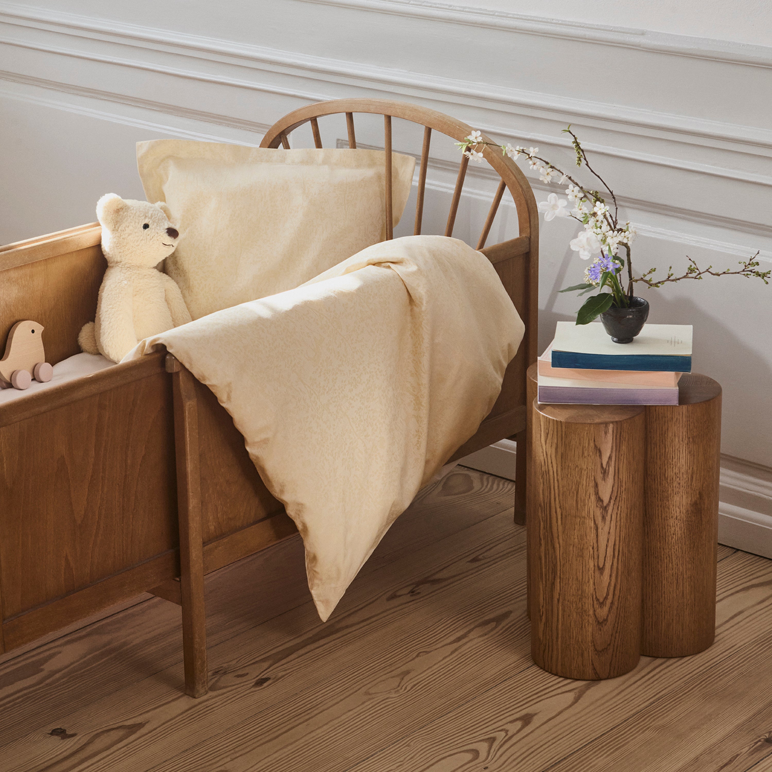 Nyudsprungne træer, kaniner og dådyr er diskret vævet ind i tekstilet med en klassisk damask-teknik og sengesættet har desuden det lille karakteristiske Georg Jensen Damask-børnelogo broderet i det ene hjørne. Udover sengetøj indeholder kollektionen også pyjamas til børn, quiltet tæppe og en lille kuffert til bamser og legetøj.