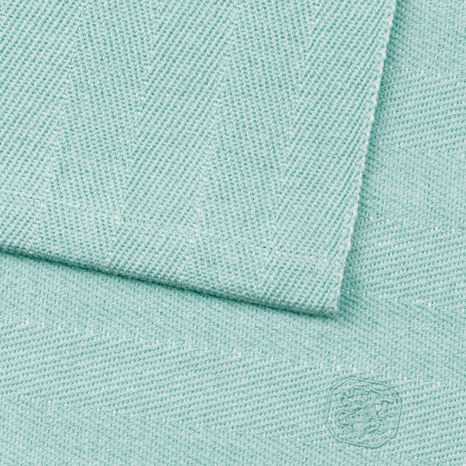 Dæk et elegant bord med Herringbone-dækkeservietterne i farven Deep Glass. Dækkeservietterne er vævet i 100 % kraftig bomuld. Vævemetoden giver det karakteristiske sildebensmønster og de kraftige garner får dækkeservietterne til at ligge tungt på bordet. De har et lille broderet logo i samme nuance som vævningen. Den klare, blågrønne nuance, Deep Glass, er inspireret af farven på råglas.