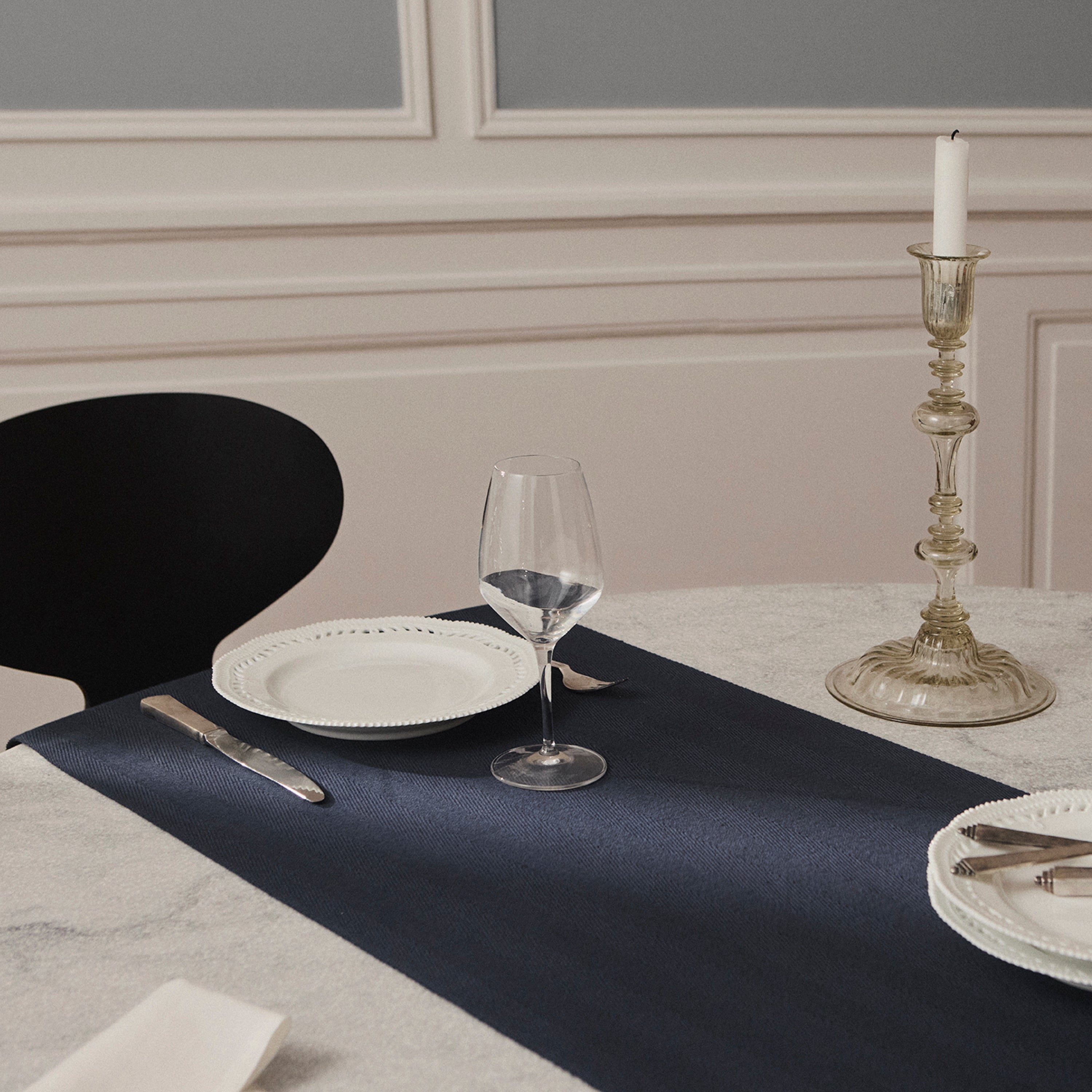 Dæk et elegant bord med Herringbone-bordløberen i Dark Blue. Den klassiske bordløber er vævet i 100 % kraftig bomuld. Vævemetoden giver det karakteristiske sildebensmønster og de kraftige garner får bordløberen til at ligge tungt på bordet. Den har et lille broderet logo i samme nuance som vævningen.