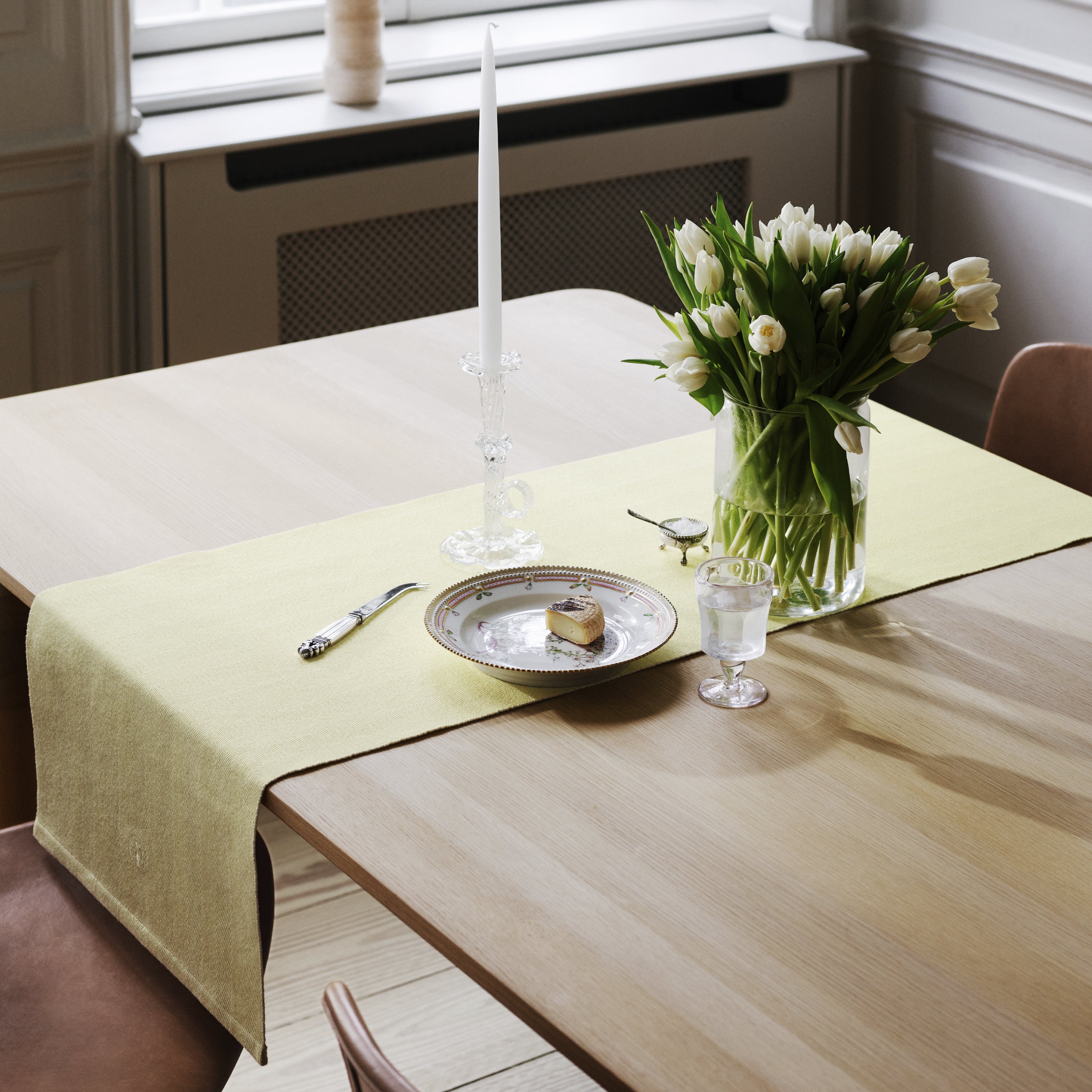 Herringbone er en sildebensvævet bordløber i 100 % kraftig bomuld. God til både hverdag og weekend. Bordløberen har et lille broderet Georg Jensen Damask-logo og fås blandt andet i farven Soft Yellow, der er en lys favorit.