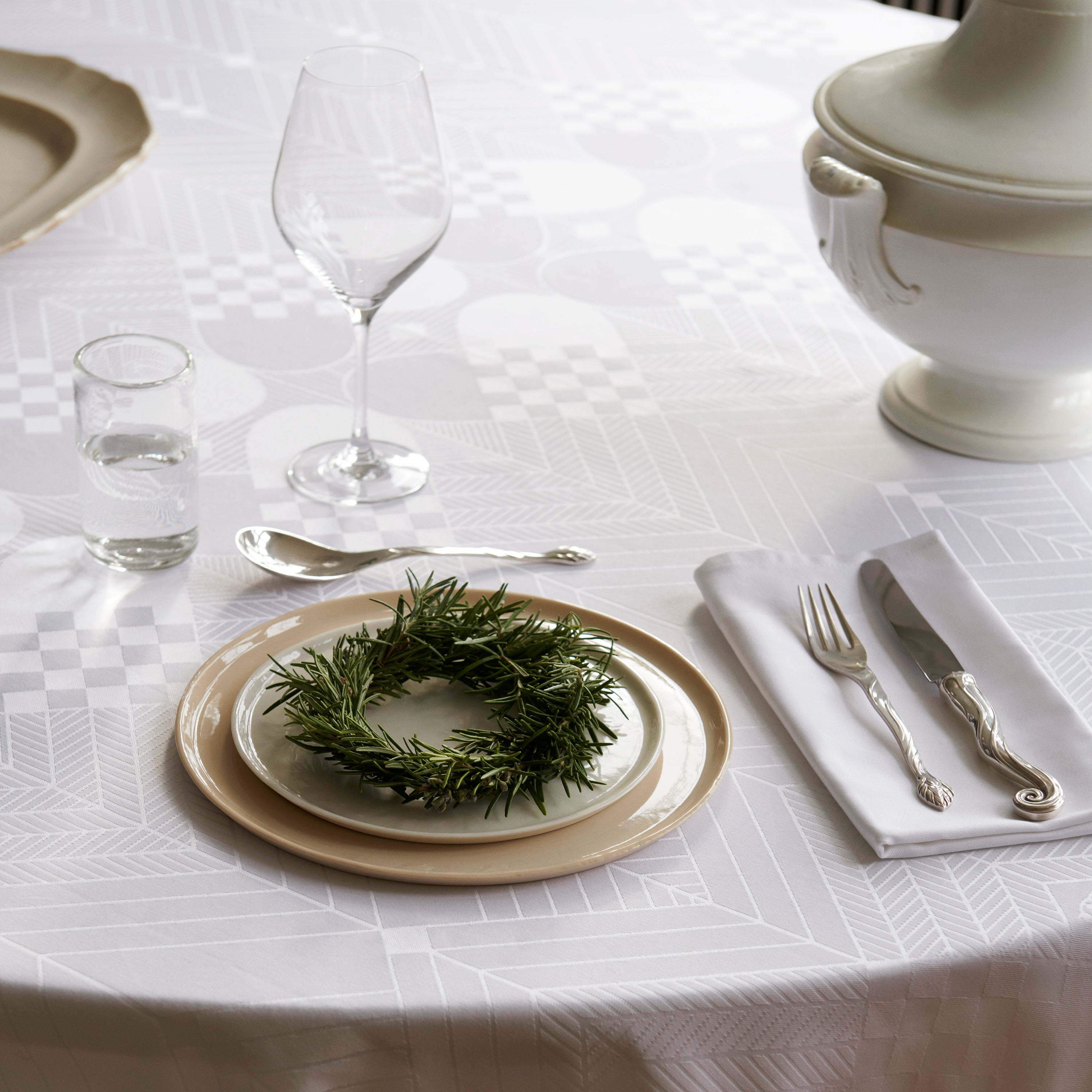 I den hvide variant toner det ikoniske mønster frem på en smuk snehvid baggrund, og gør dugen til et tidløst element i borddækningen. Et elegant lærred, der kan kombineres med pynt i mange forskellige farver eller holdes helt klassisk og minimalistisk.