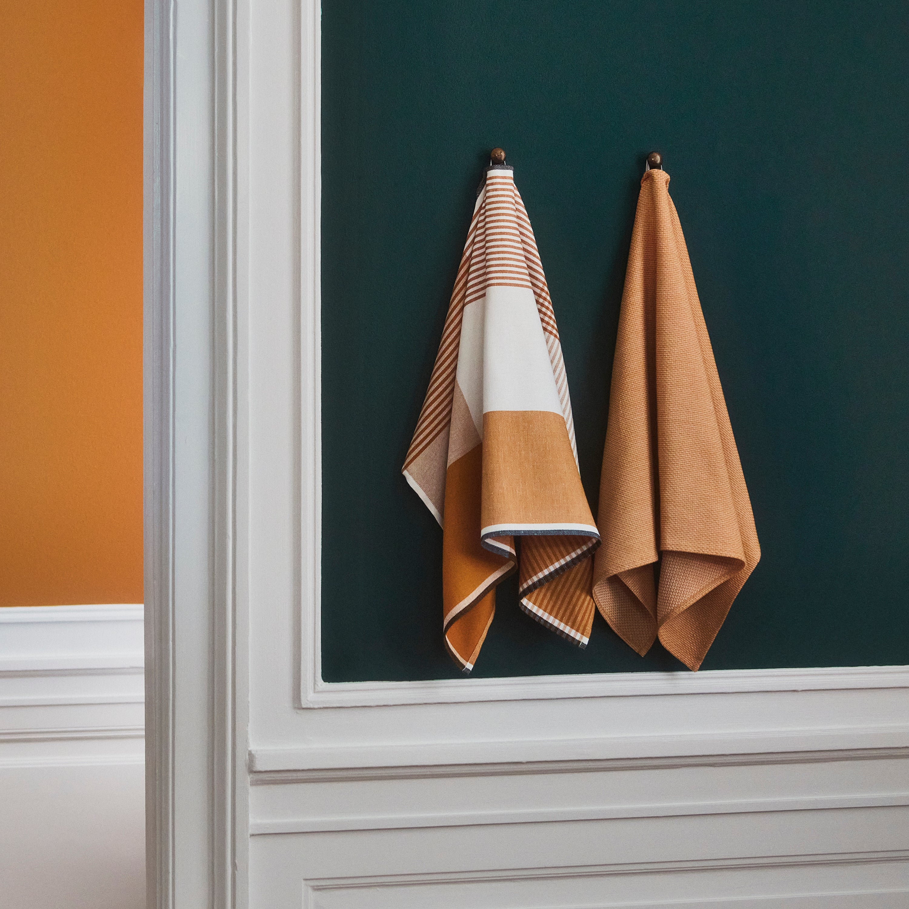 1959 er et klassisk vævet køkkenhåndklæde i blød bomuld. Køkkenhåndklædets vaflede struktur sikrer en optimal tørreevne, og den kraftige kvalitet gør det muligt at bruge det både som håndklæde og viskestykke. Chanterelle er en dyb orange med undertoner af karamel – inspireret af kantarellens smukke nuancer.