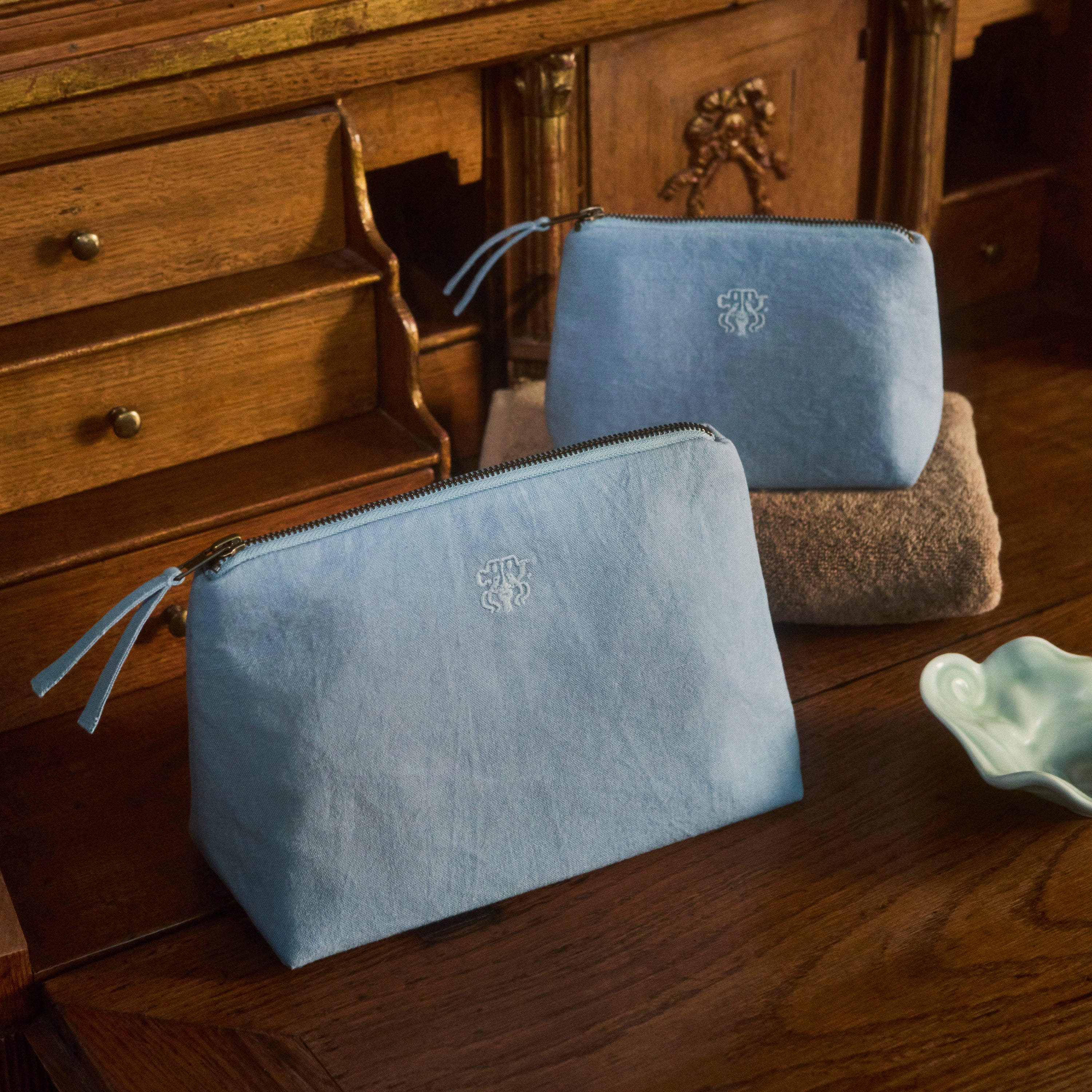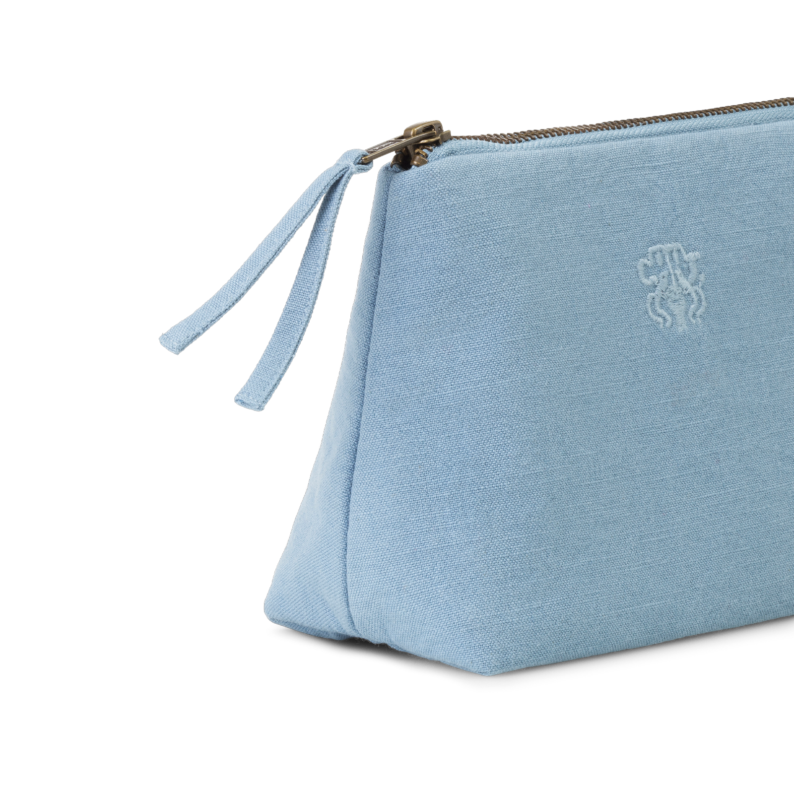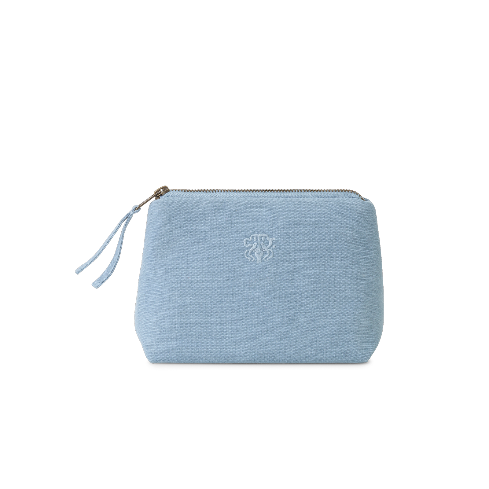 Funktionel og rummelig kosmetikpung i et tidløst design. All kosmetikpungen er vævet i 100 % bomuld med en indre lomme og har Georg Jensen Damasks logo broderet som elegant detalje. Farven Blue Hour er en smuk og tidløs, mellemblå farve.