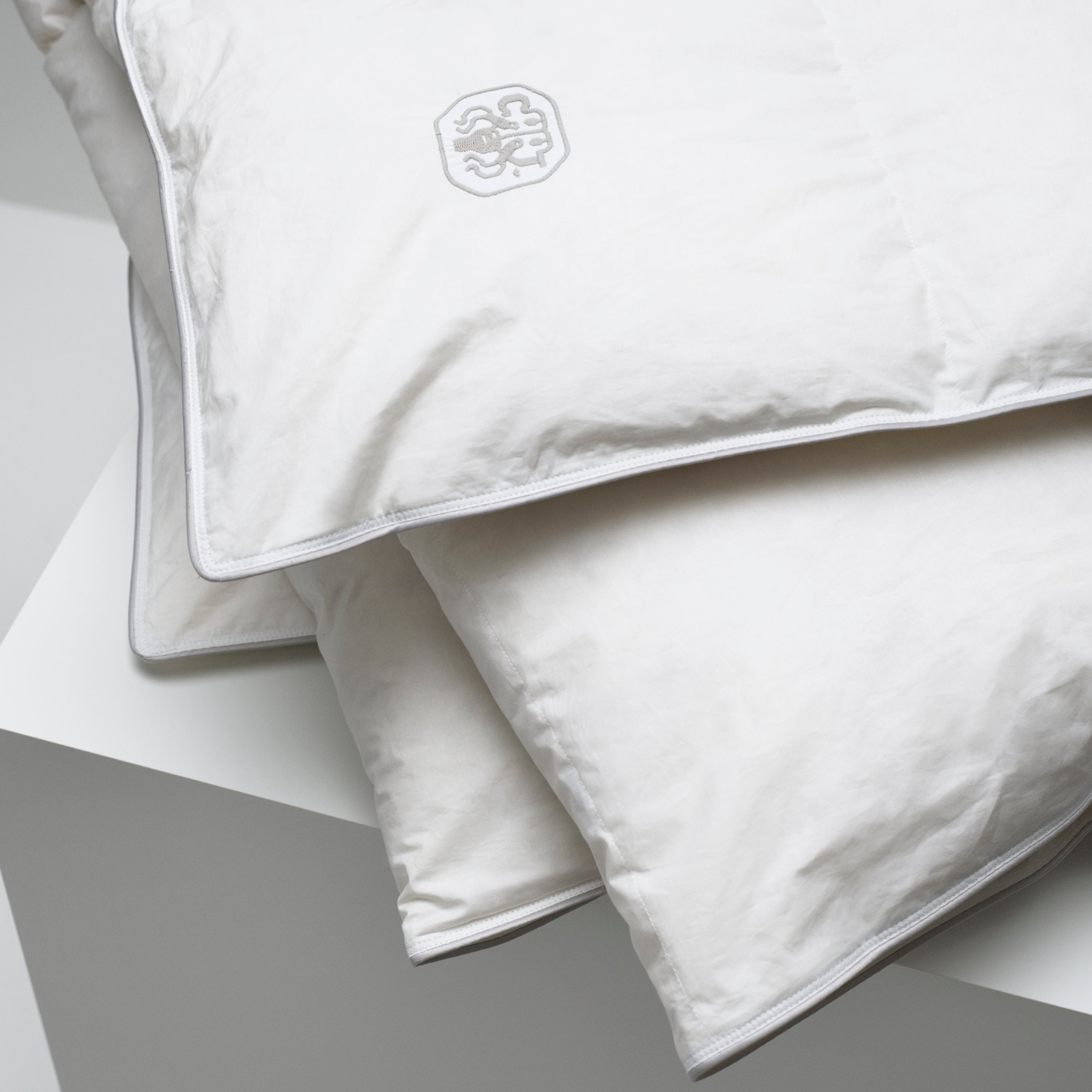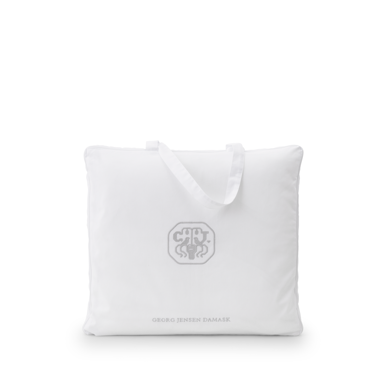 Dynen bærer Georg Jensen Damasks ikoniske logo som et diskret broderi – et symbol på kvalitet og omhyggelighed.