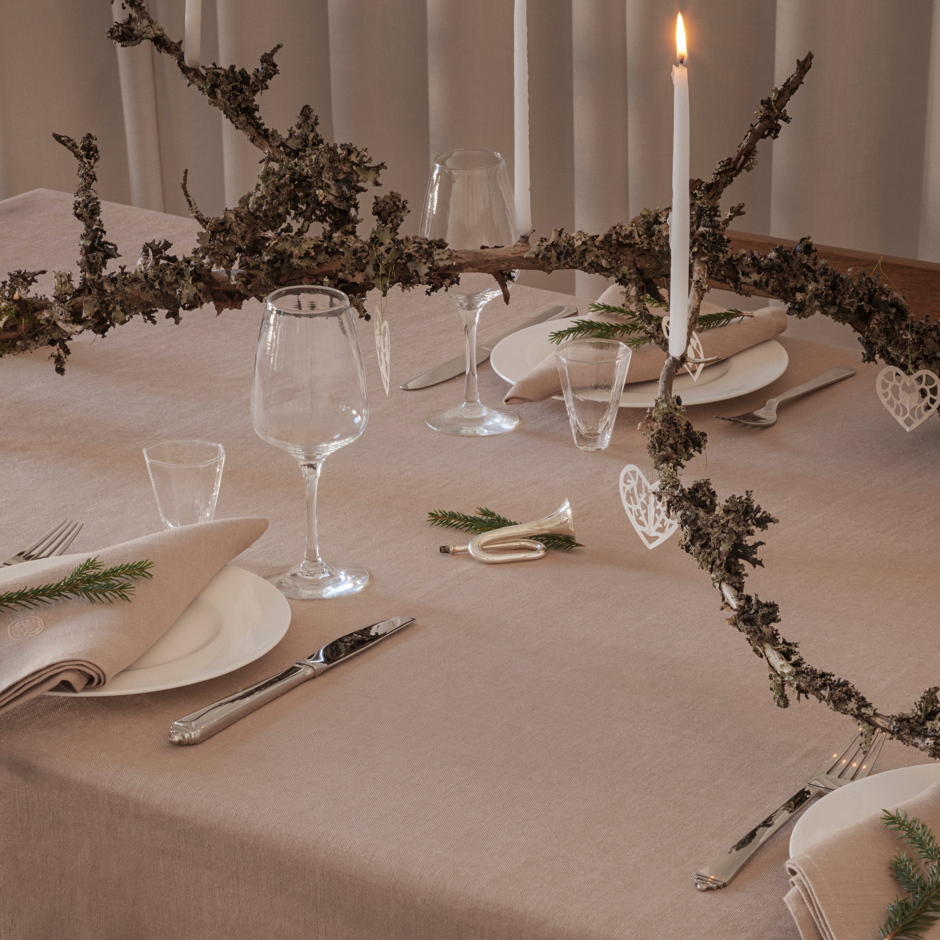 Hørdugen er designet af vores eget designteam, og den hylder fortidens stærke traditioner gennem både materialevalg og udtryk. Dugen har et diskret broderet Georg Jensen Damask-logo.
