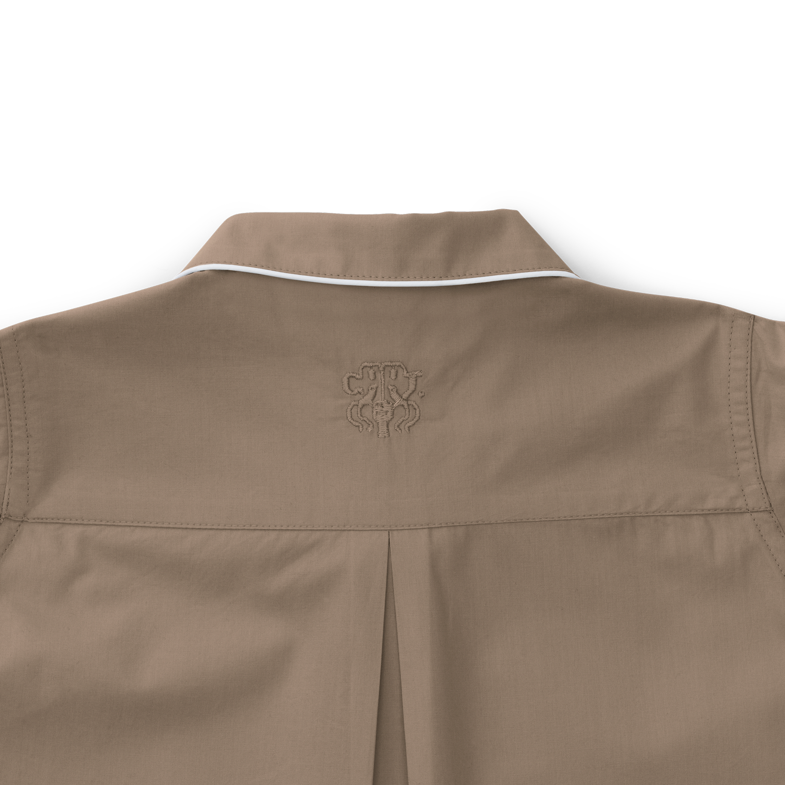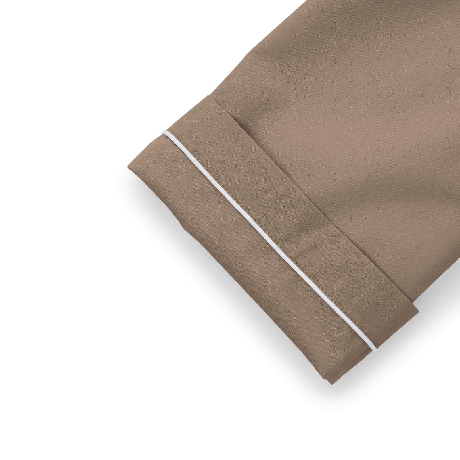 Skjorten har sideslidser, brystlomme, afrundet krave og Georg Jensen Damasks ikoniske logo broderet på bærestykket i nakken. Bukserne har en bred og behagelig elastik i taljen og lommer. Bukse- og ærmelængde kan let tilpasses med et opsmøg, hvor indersiden har en elegant piping.