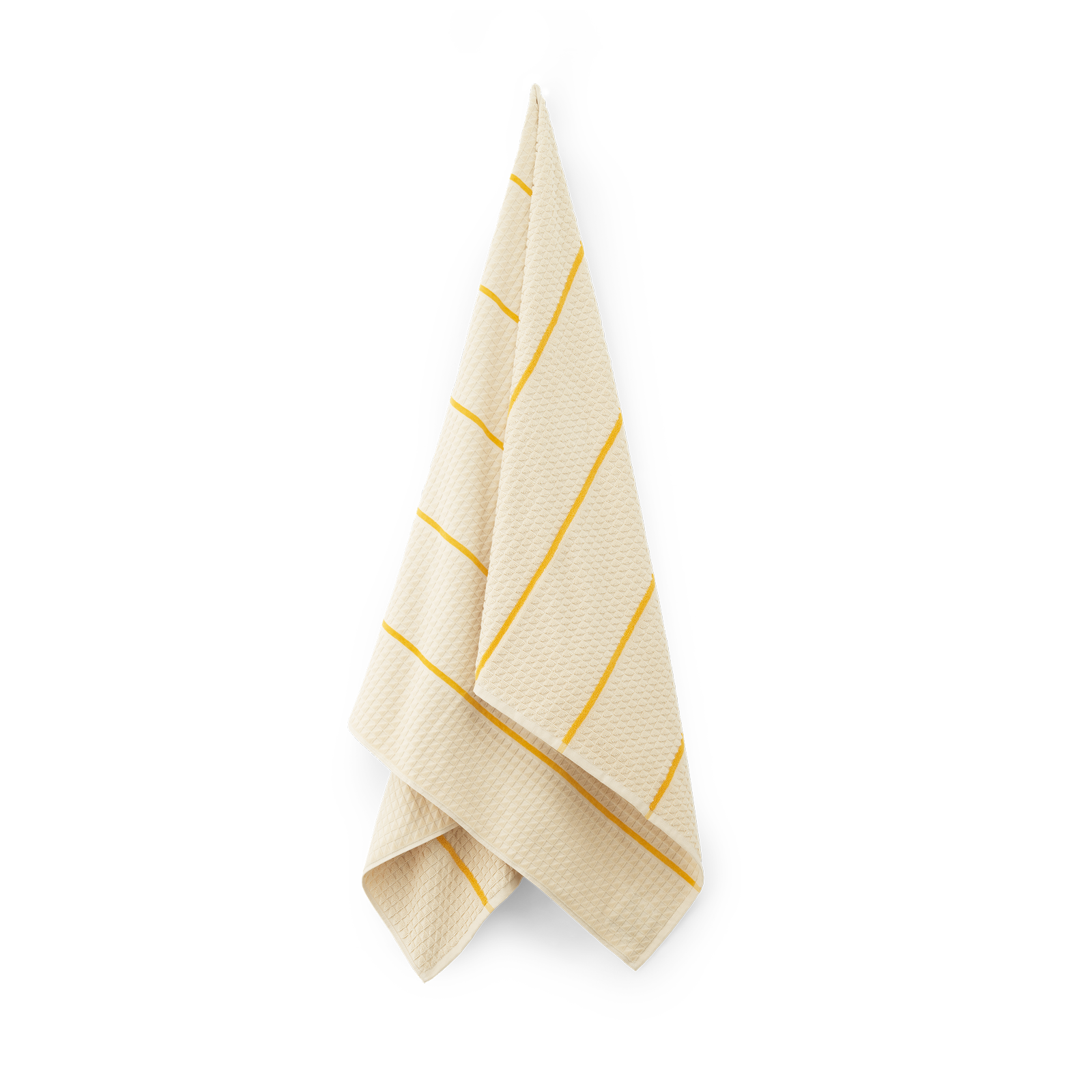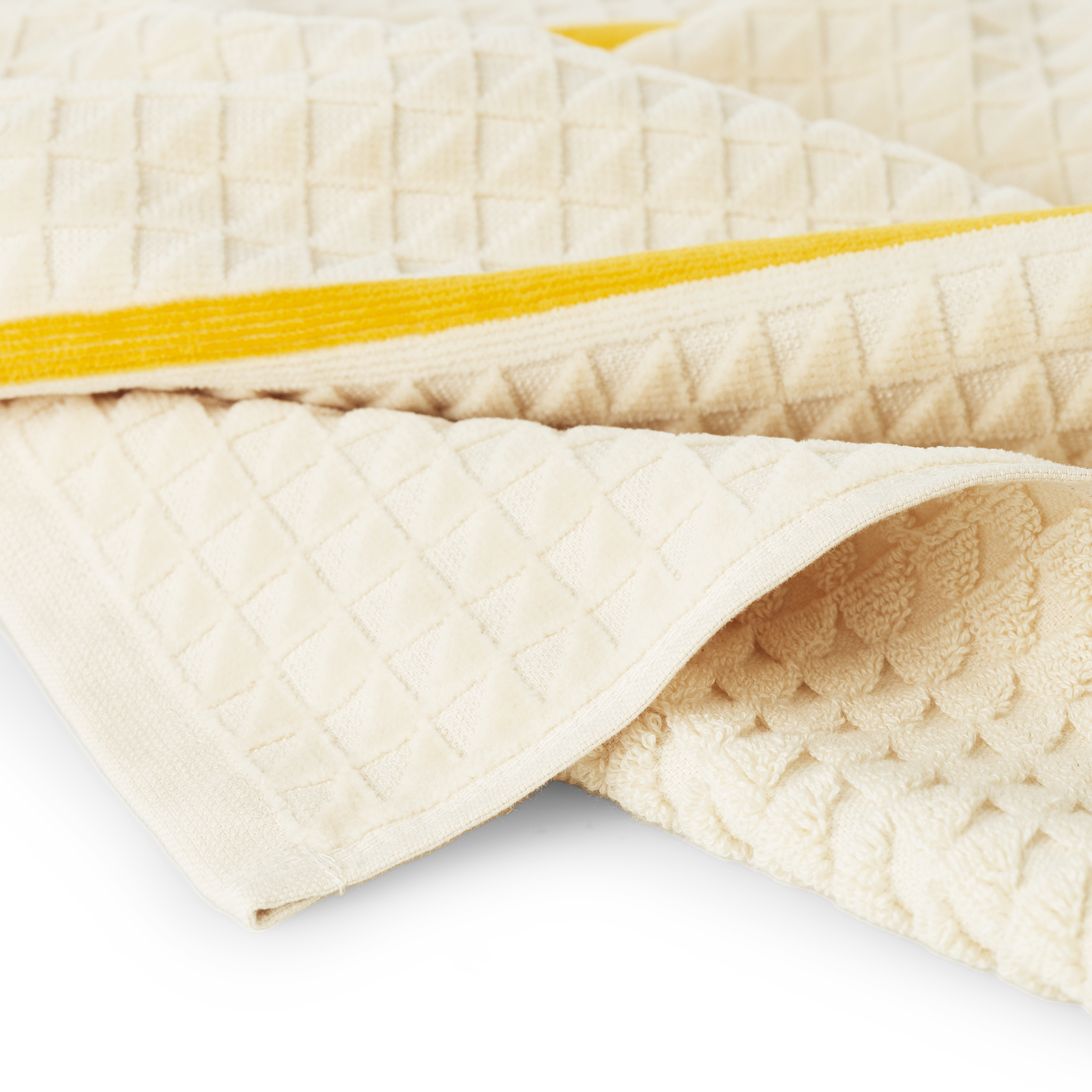 Georg Jensen Damasks elegante Speciel Edition strandhåndklæde er skabt med udgangspunkt i det ikoniske facetmønster, hvor designer og væver Jette Nevers har udnyttet jacqardvævningen til at skabe et elegant skyggespil i mønsterets sammenhængende trekanter. I Special Edition strandhåndklædet fremhæves den smukke geometri i blød velourfrotté med lodrette delinger af solsikkegule striber.