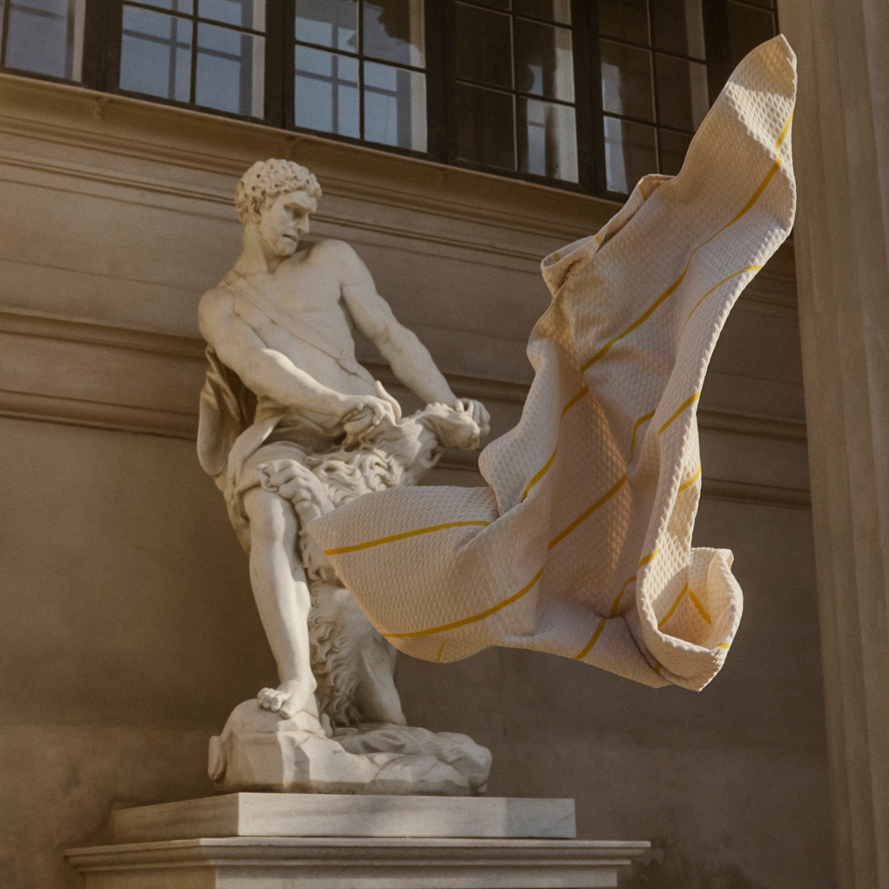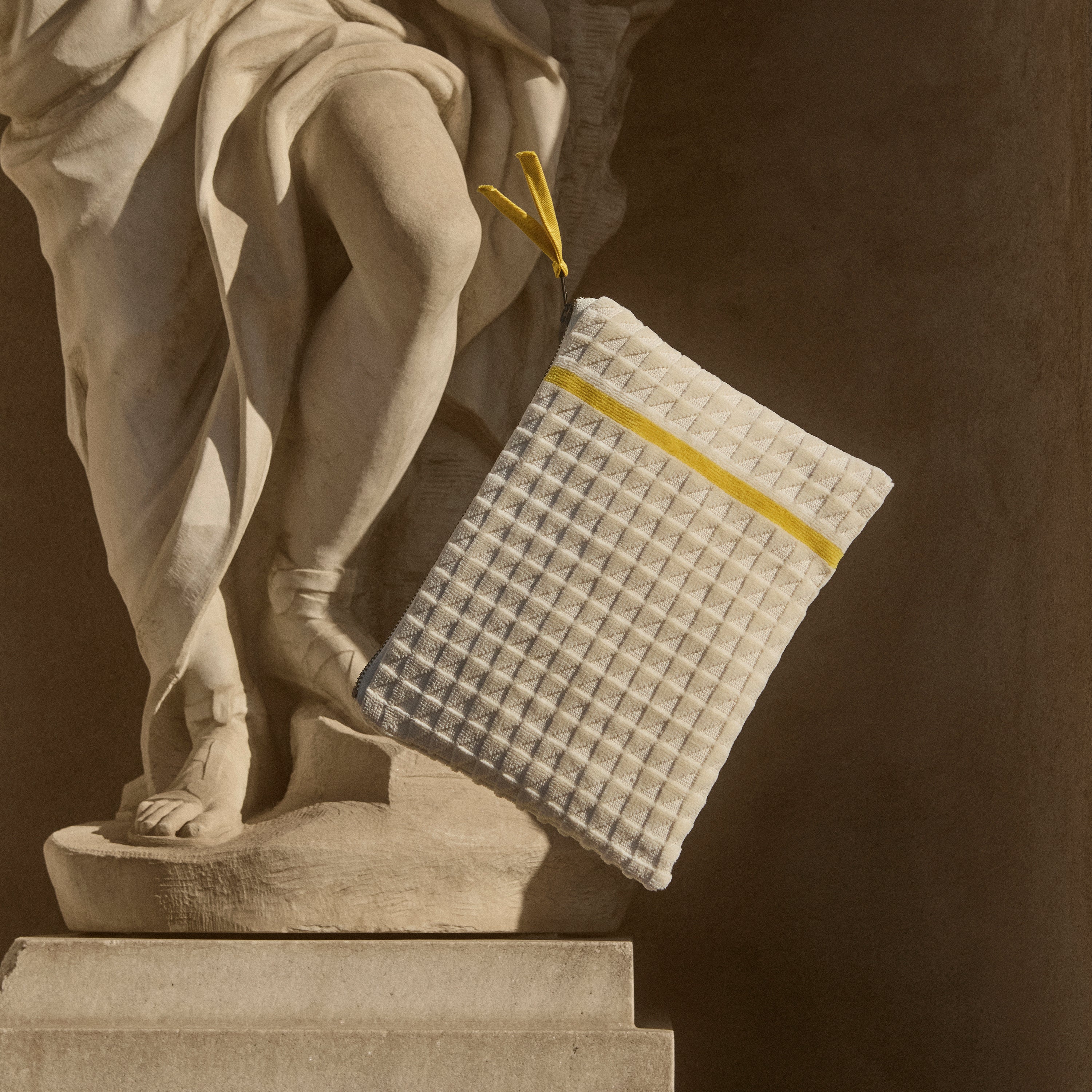 Georg Jensen Damasks elegante Speciel Edition clutch er skabt med udgangspunkt i det ikoniske facetmønster, hvor designer og væver Jette Nevers har udnyttet jacqardvævningen til at skabe et elegant skyggespil i mønsterets sammenhængende trekanter. I Special Edition clutchen fremhæves den smukke geometri i blød velourfrotté med lodret deling af en solsikkegul stribe.