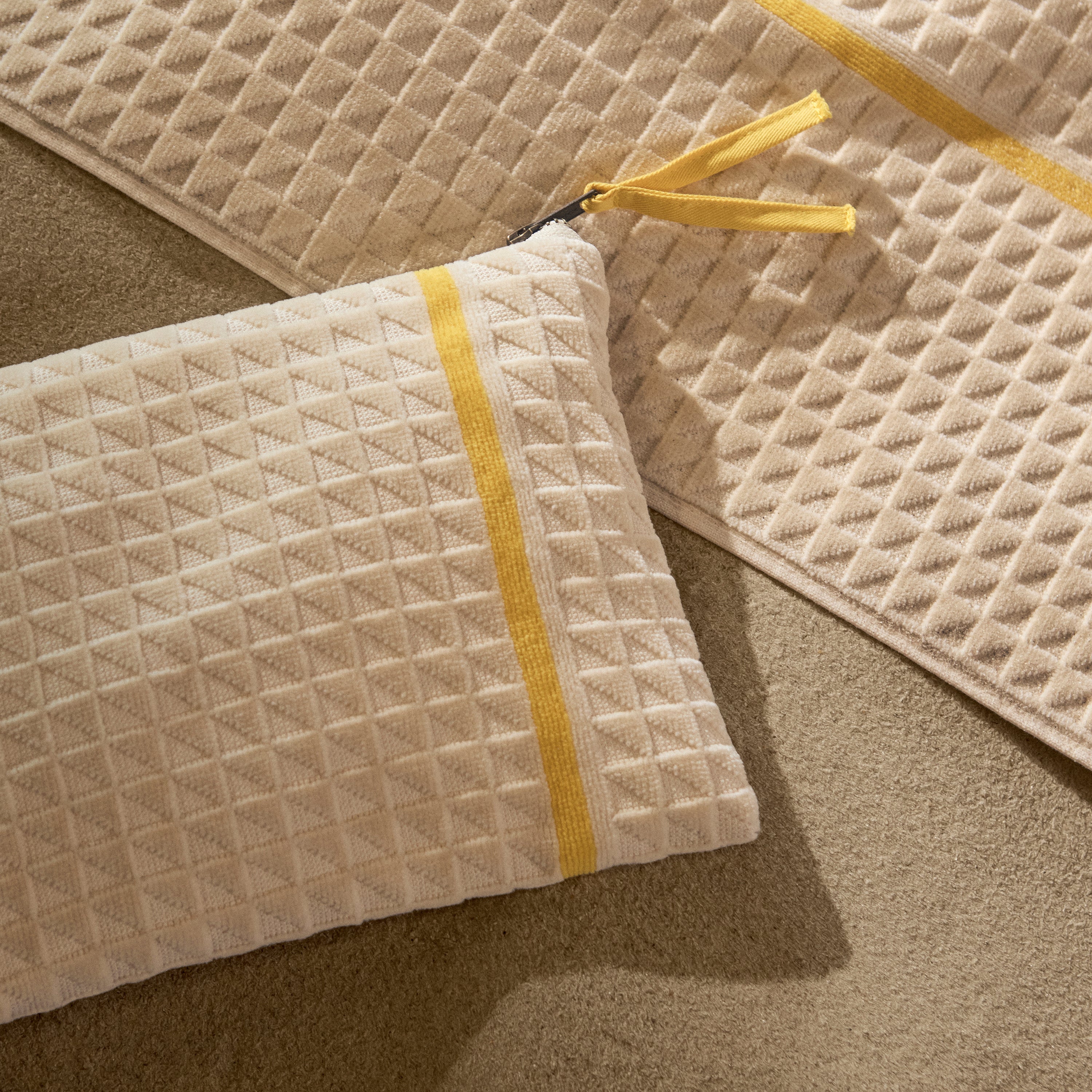 Med Facet udnyttede Jette Nevers jacqardvævningen til at skabe et elegant skyggespil i mønsterets sammenhængende trekanter. I Special Edition strandhåndklædet og clutchen fremhæves den smukke geometri i blød velourfrotté med lodrette delinger af solsikkegule striber.