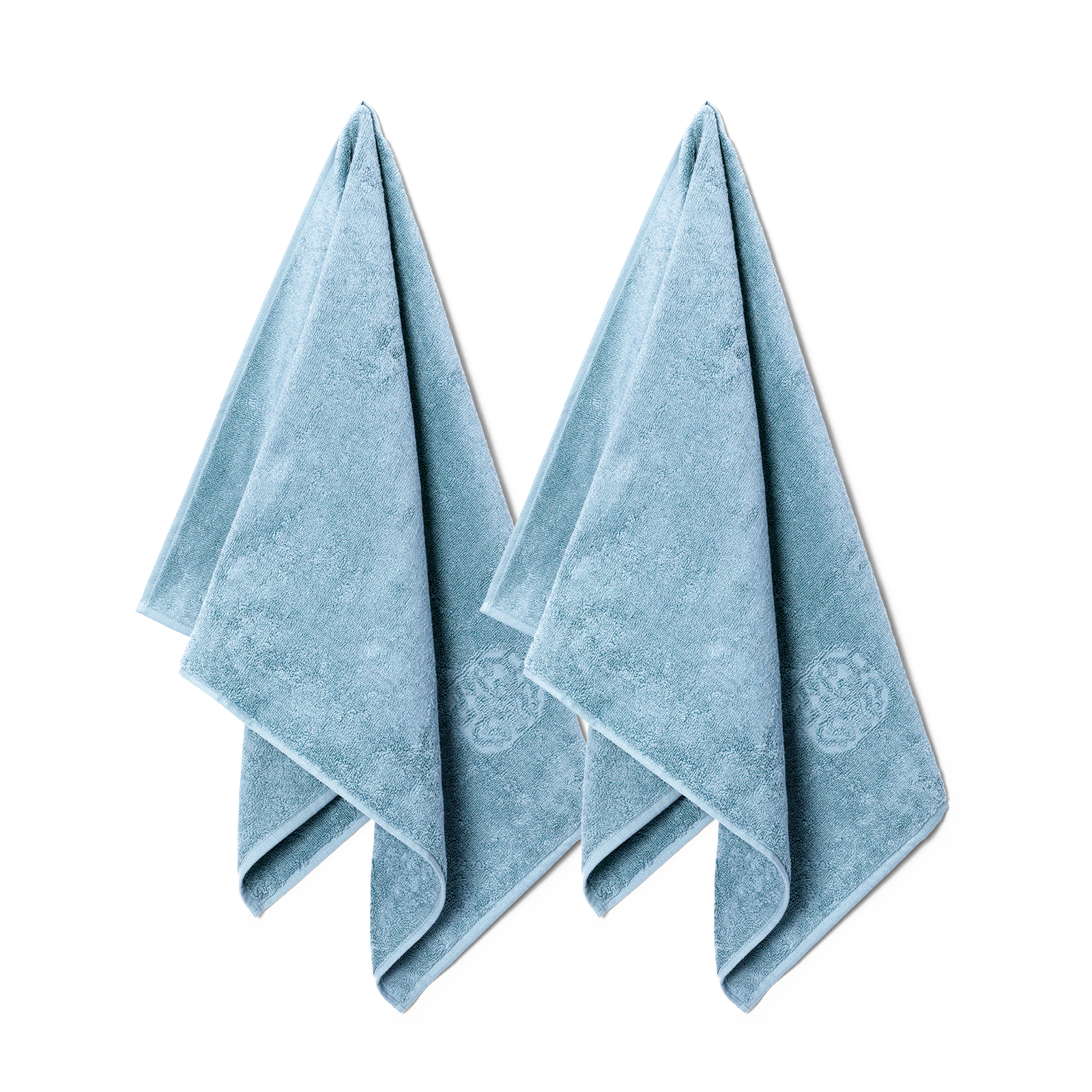 2 pcs. Damask Terry towels in the colour Blue Hour – a beautiful and timeless medium blue shade. The towels feature a simple design with Georg Jensen Damask’s iconic logo woven in as an elegant detail.