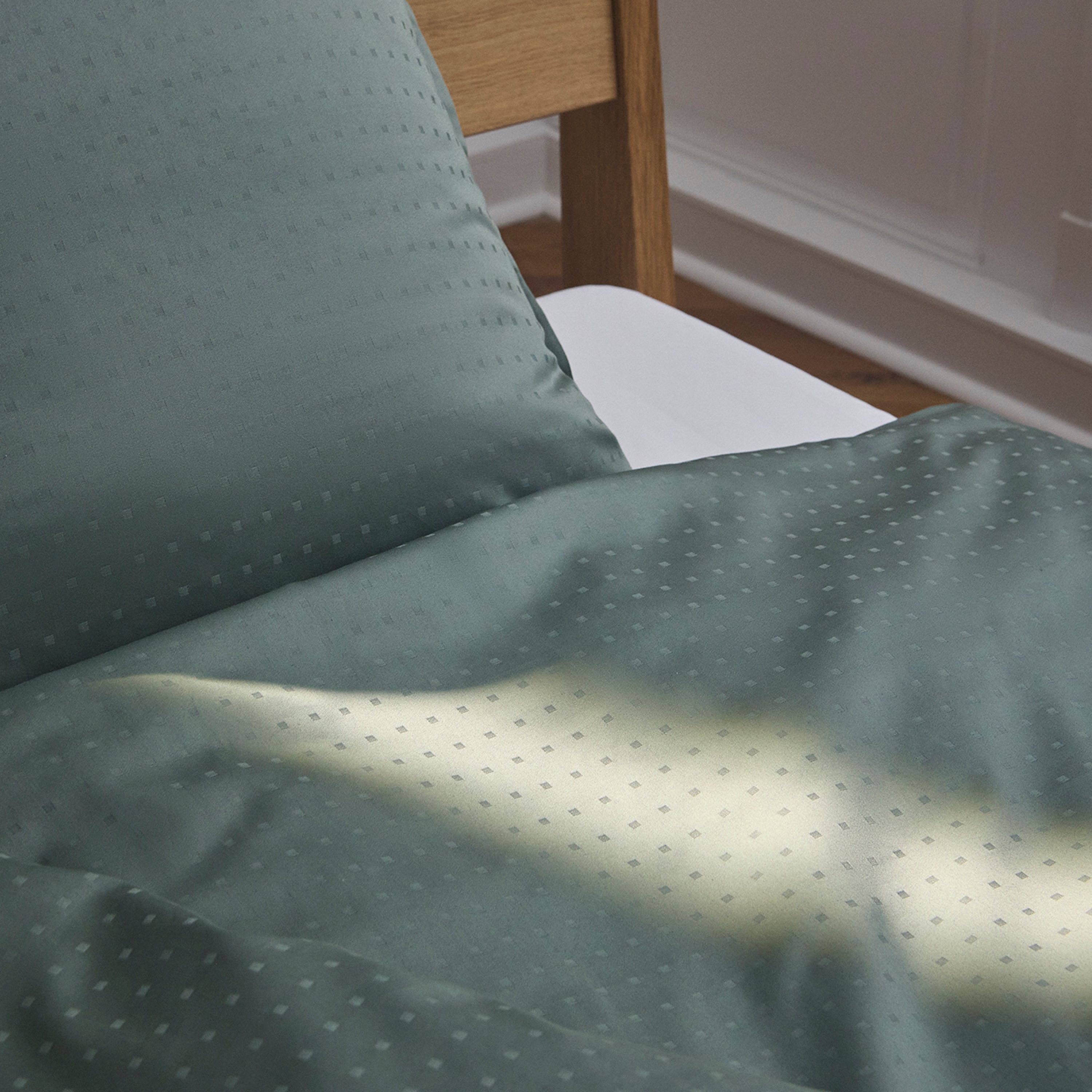 2 bedding sets in soft and lustrous fabric with a geometric pattern. The clean design with small cubes is beautifully highlighted by the reflective satin weave, giving the Light bedding a light and harmonious expression. Light is Oeko‑Tex®‑certified and woven in 100% long‑staple cotton, making it extra durable. The colour Dusty Green is a muted green.
