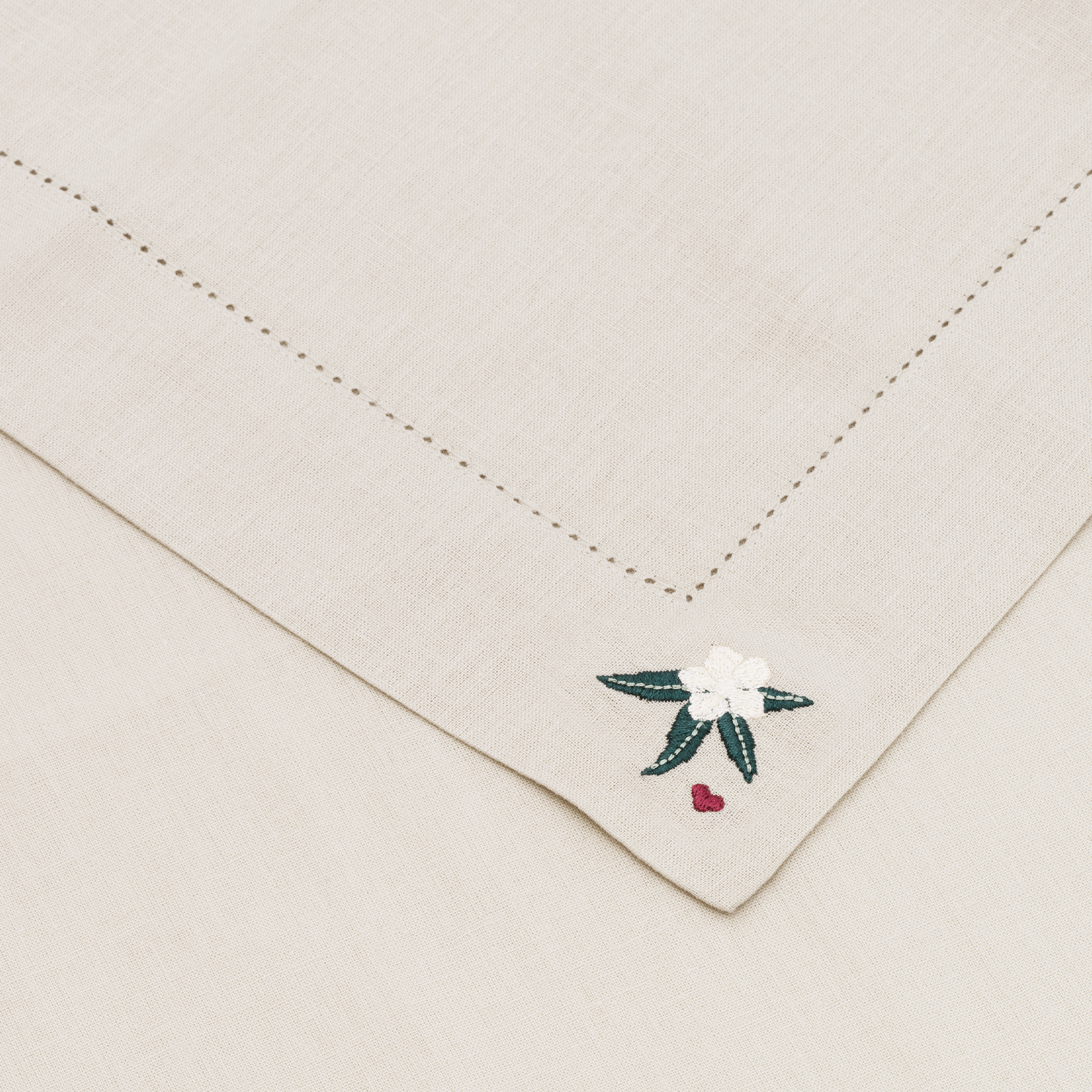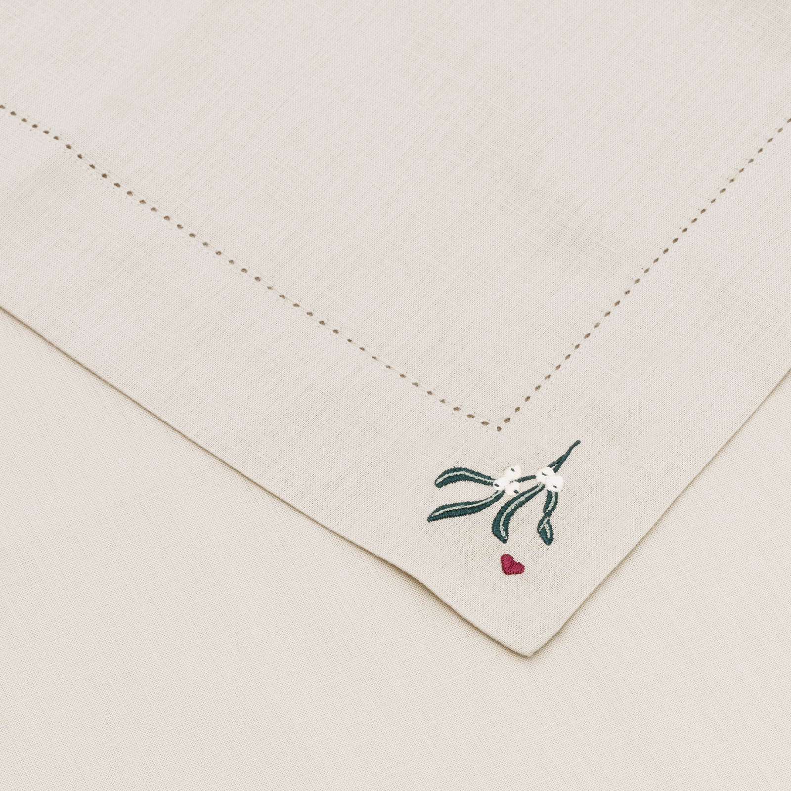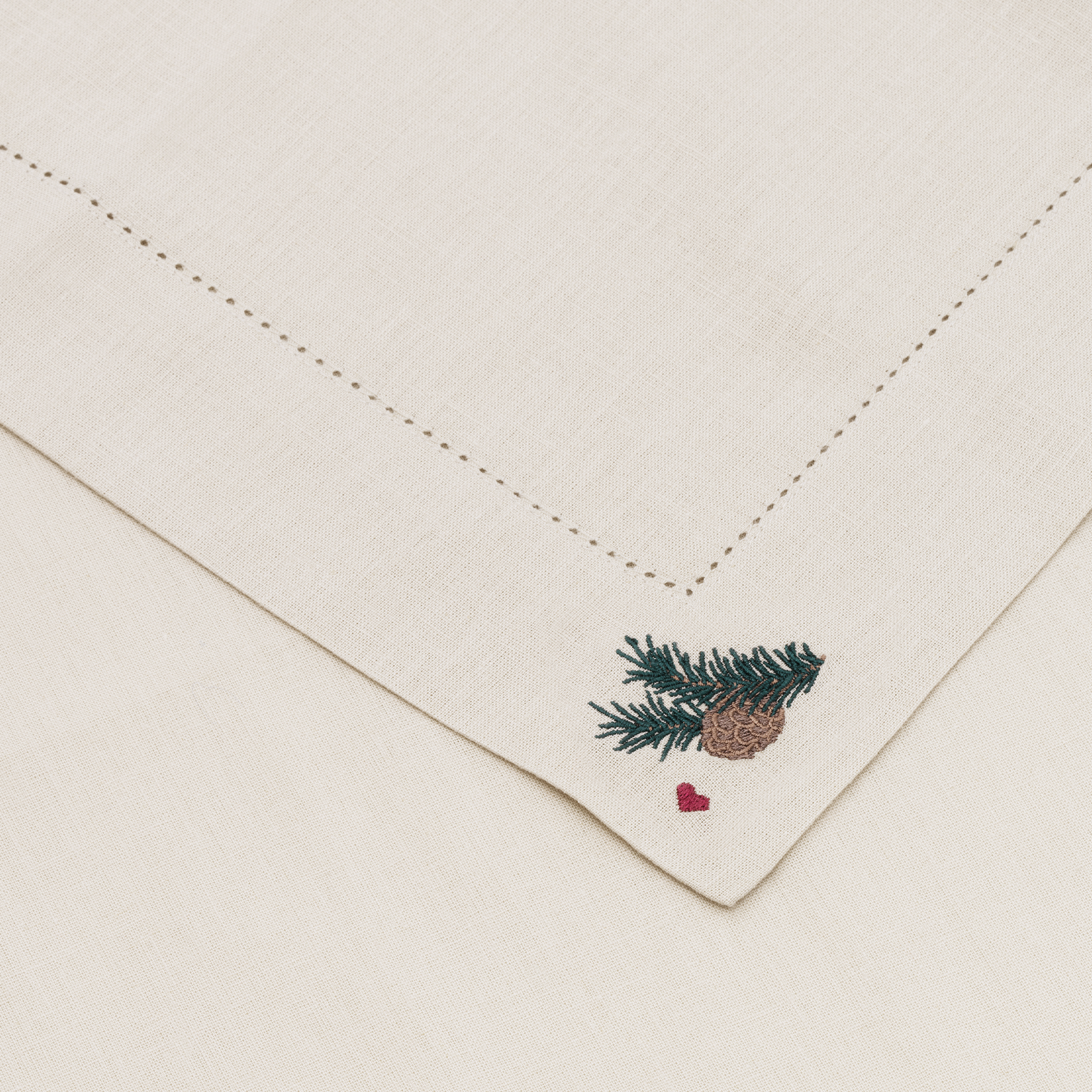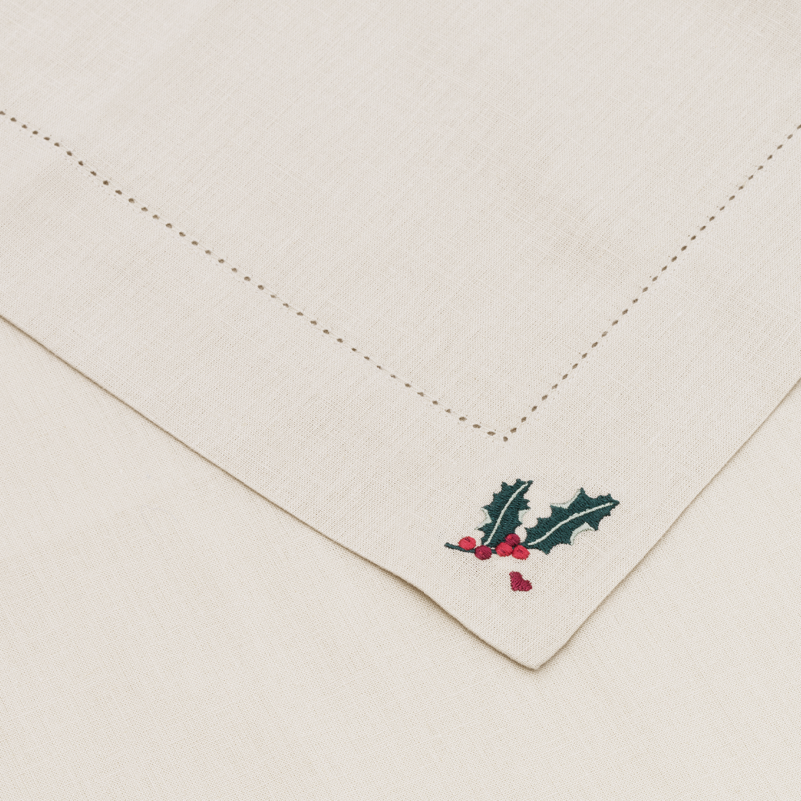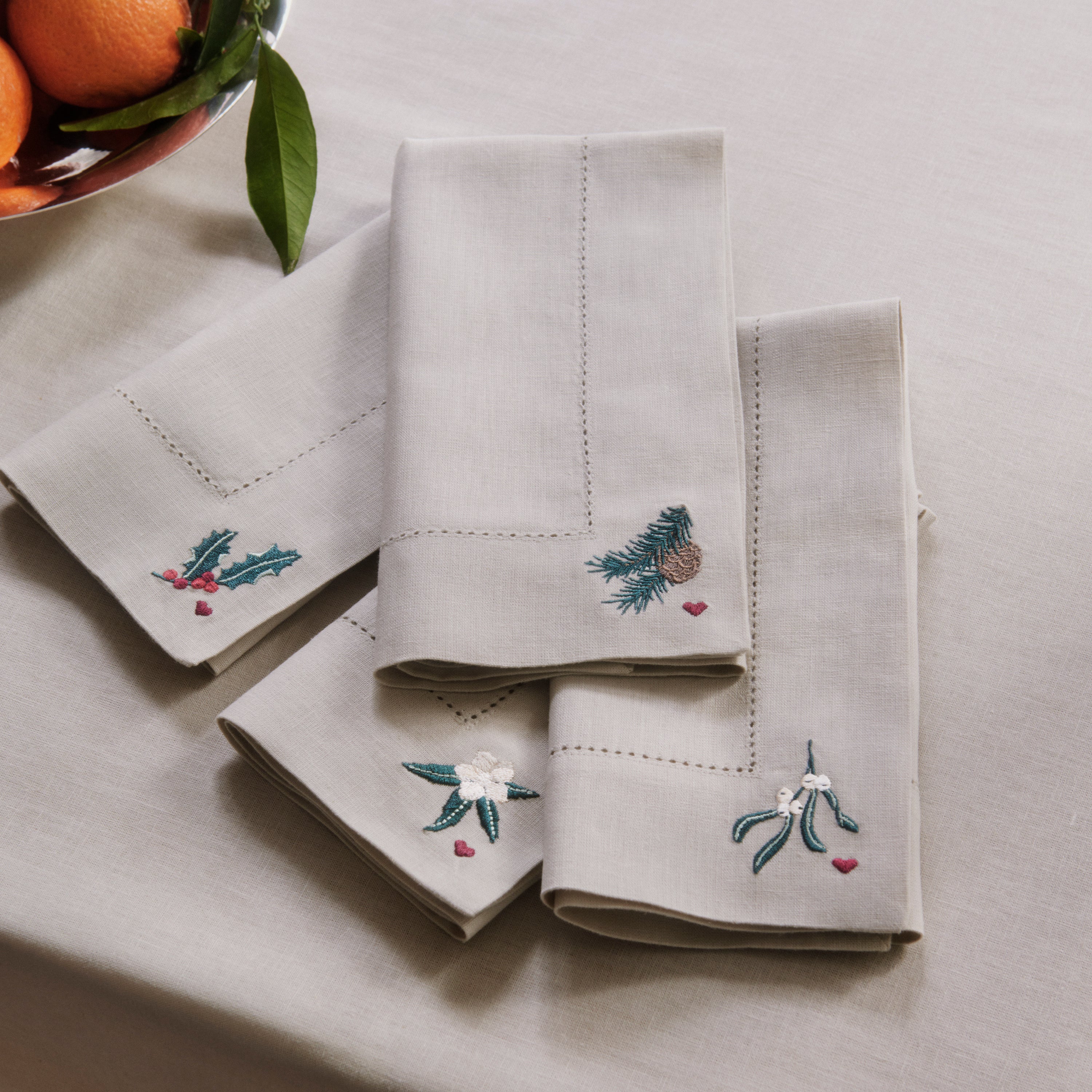 The natural-coloured napkins each feature an embroidered motif of either a Christmas rose, holly, mistletoe or a fir branch with cone, framed by an elegant hemstitch border.