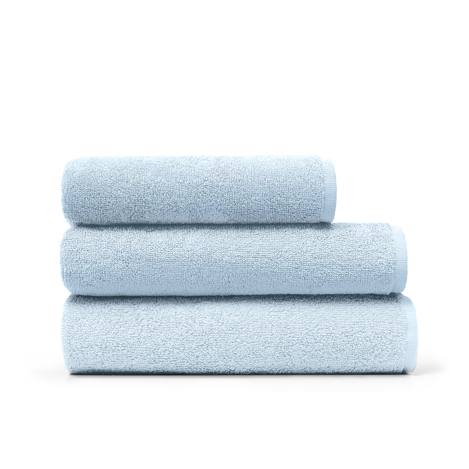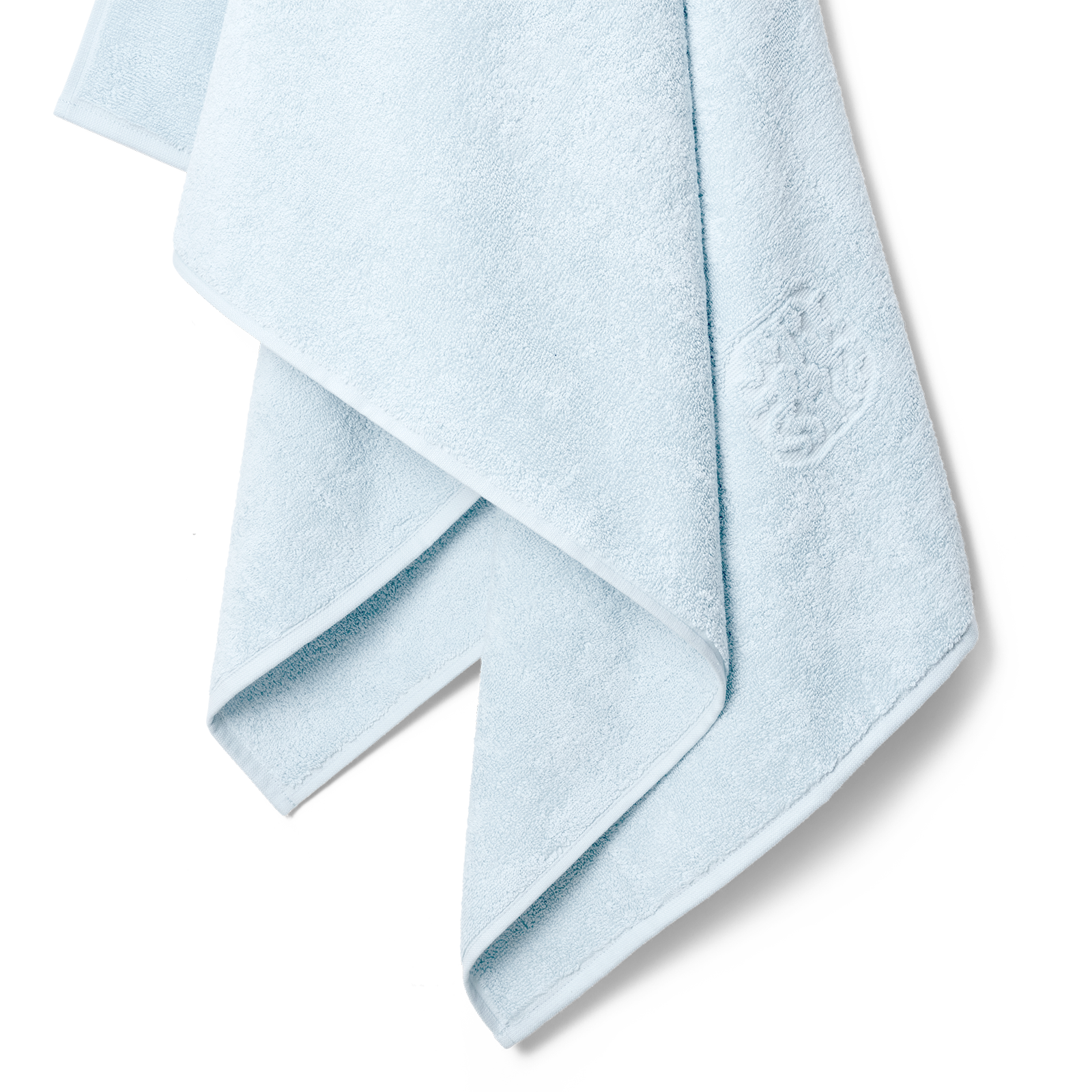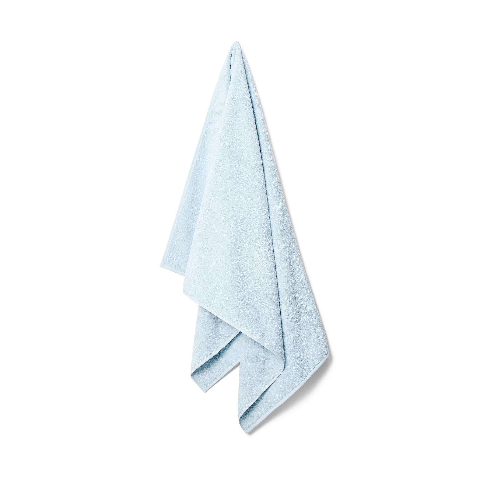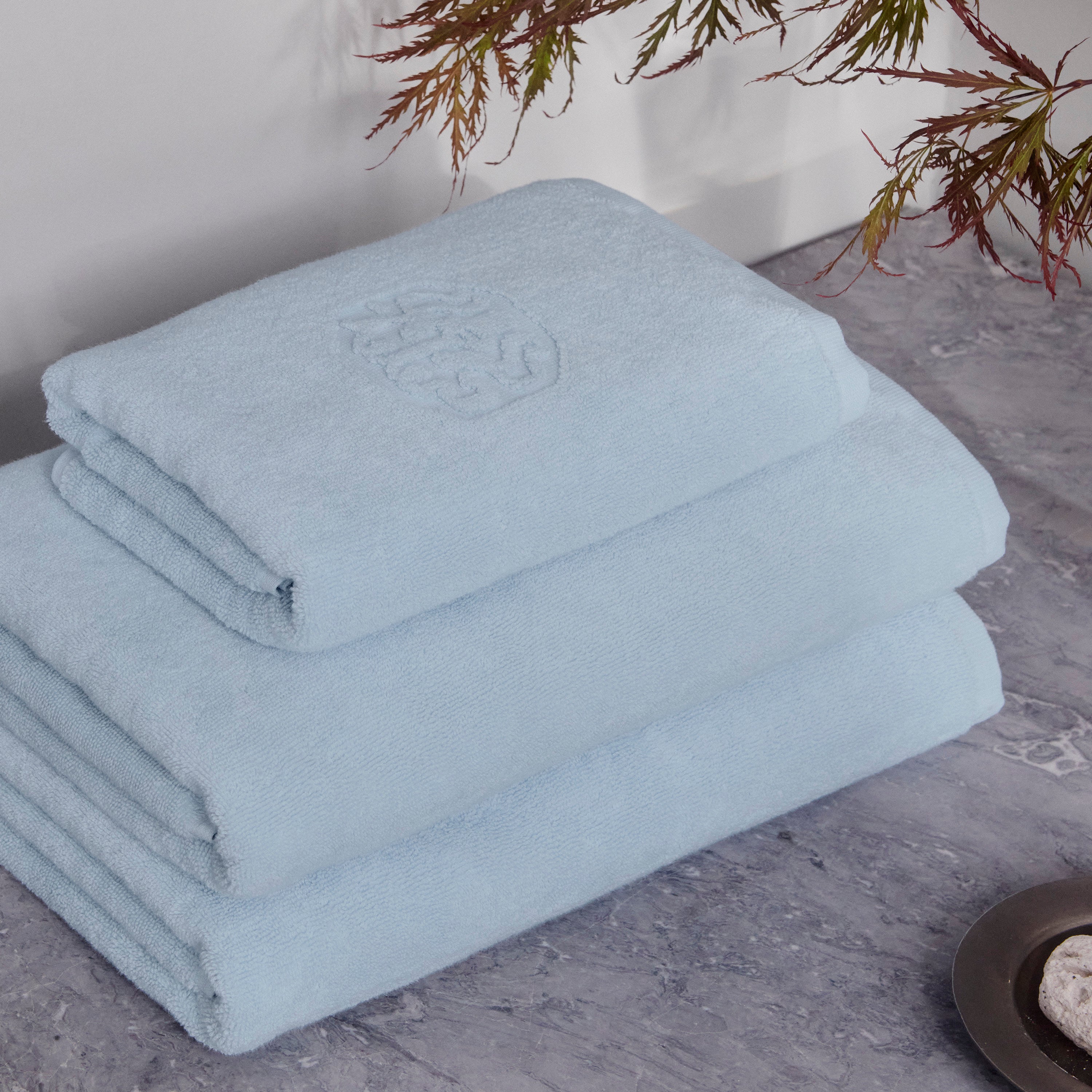 The Damask Terry bath towel has a simple look with the iconic Georg Jensen Damask logo woven in as an elegant detail. Minimal Blue is a very light shade of light blue with a hint of aqua.