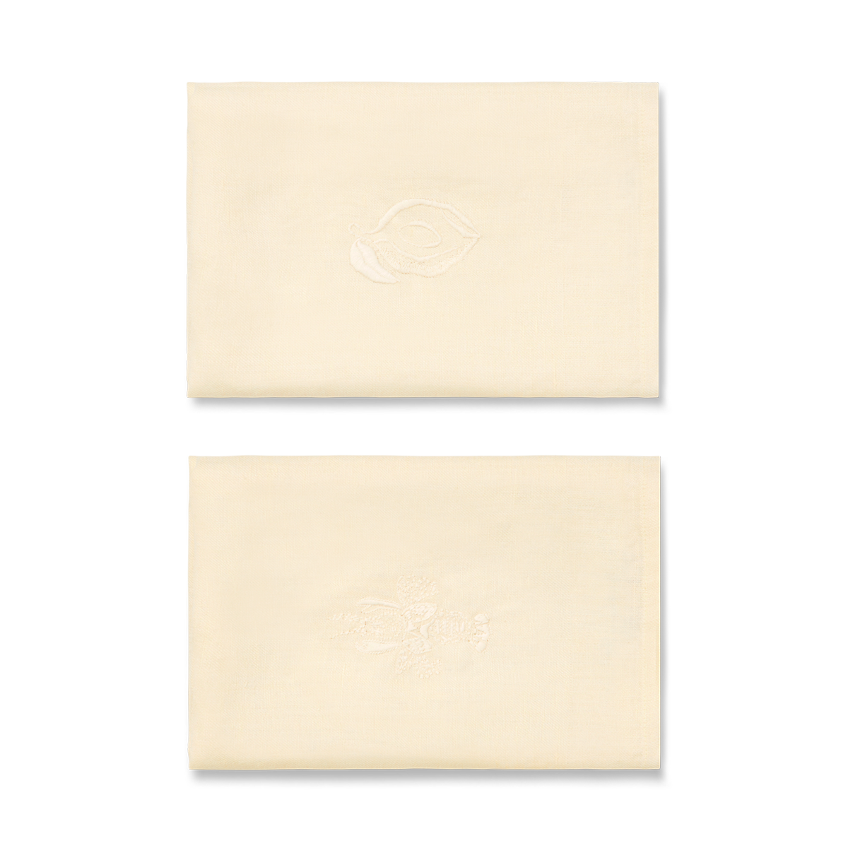 The Banquet napkin is woven from 100% linen and features a fine embroidered motif. The lobster and lemon motifs were inspired by the Renaissance feast and are featured on separate napkins in a set.