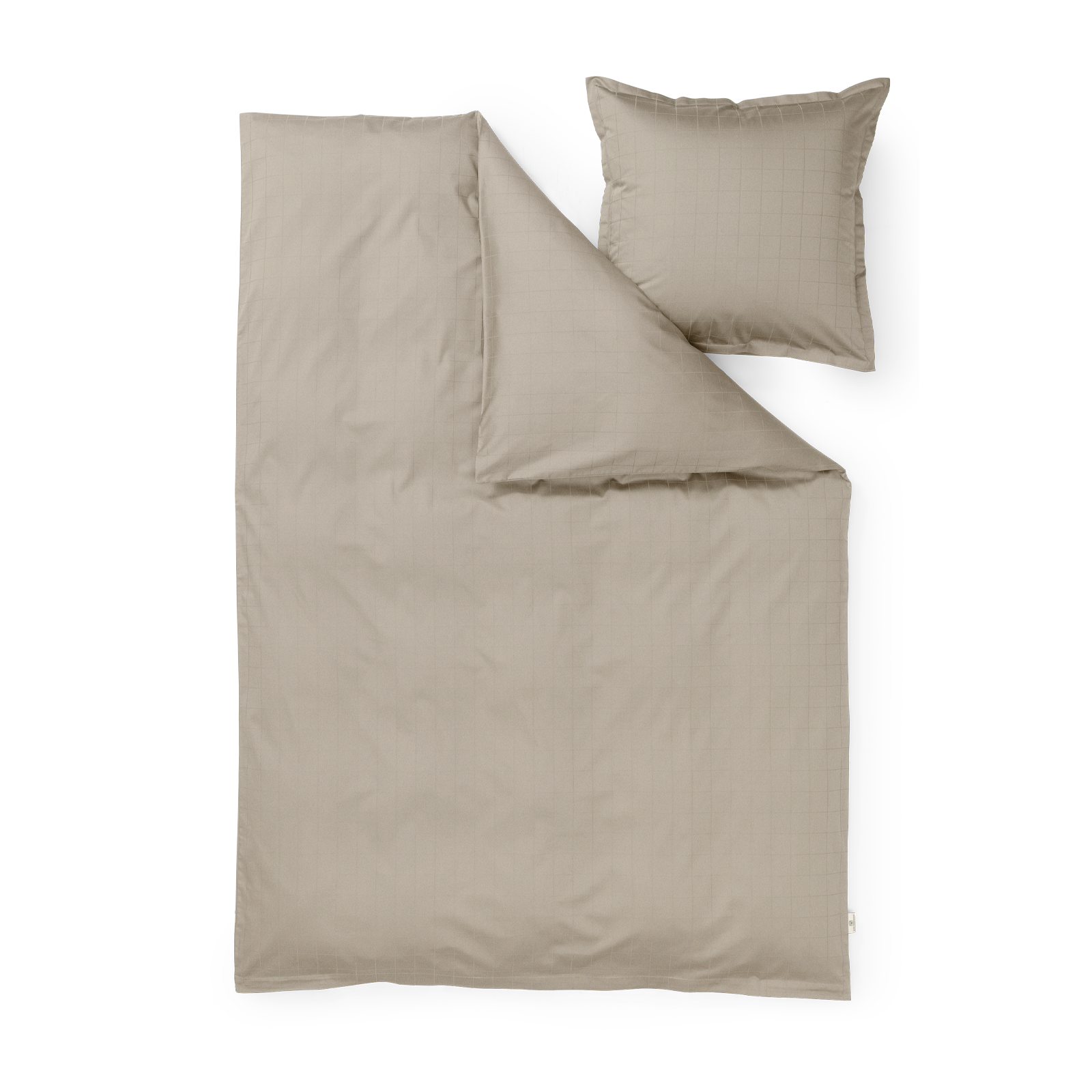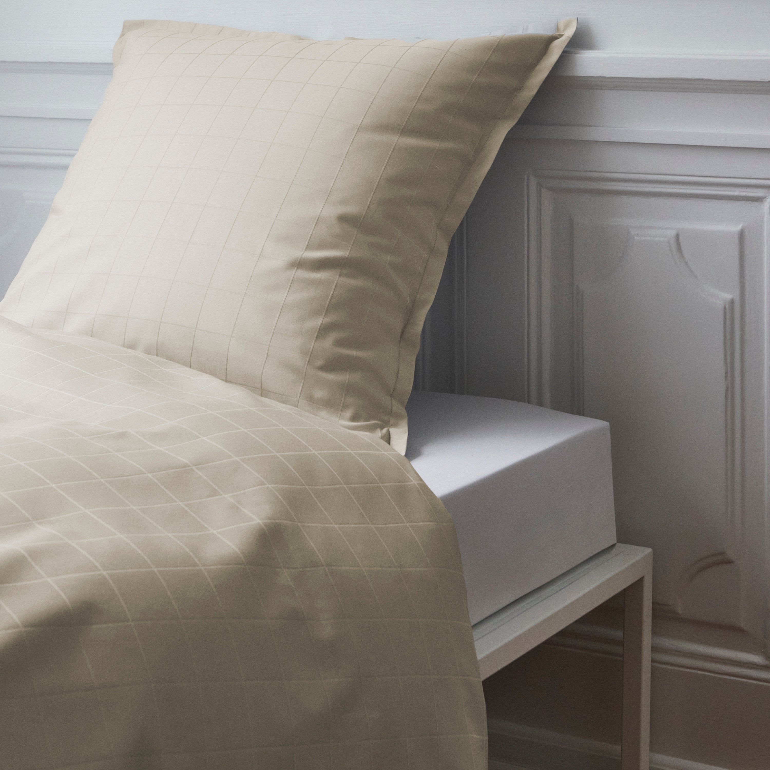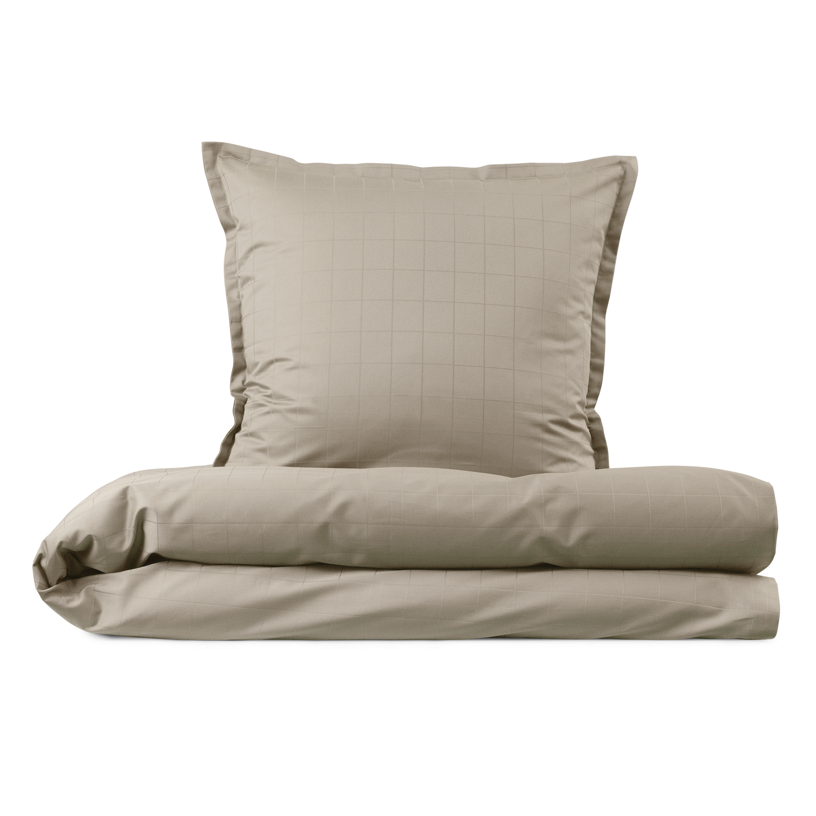 Light Squares bed linen in the colour Grey Sand. Light Squares features a light graphic pattern highlighted by the fine satin weave. It is woven in 100% combed cotton, giving a strong and soft surface. Grey Sand is a warm shade of grey.