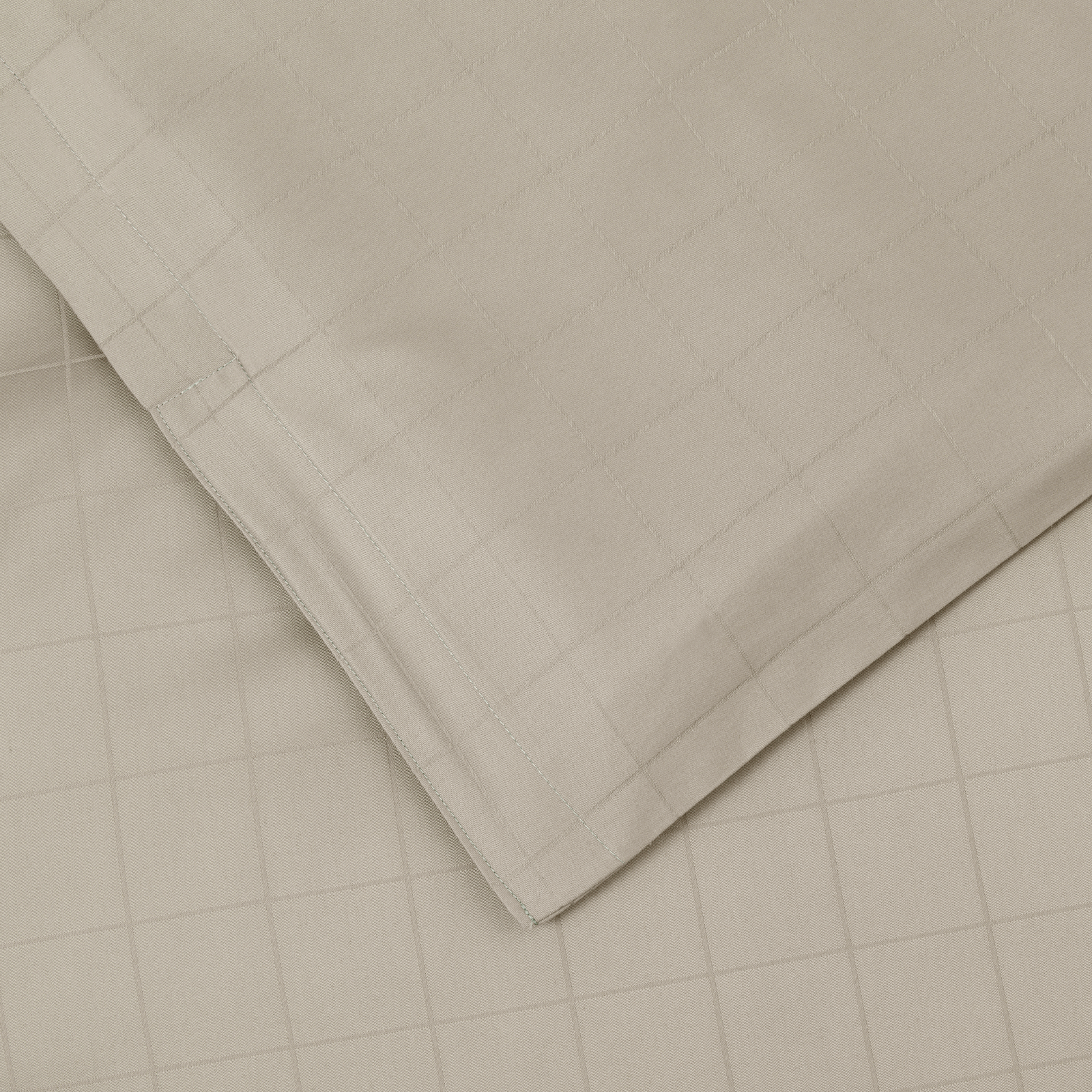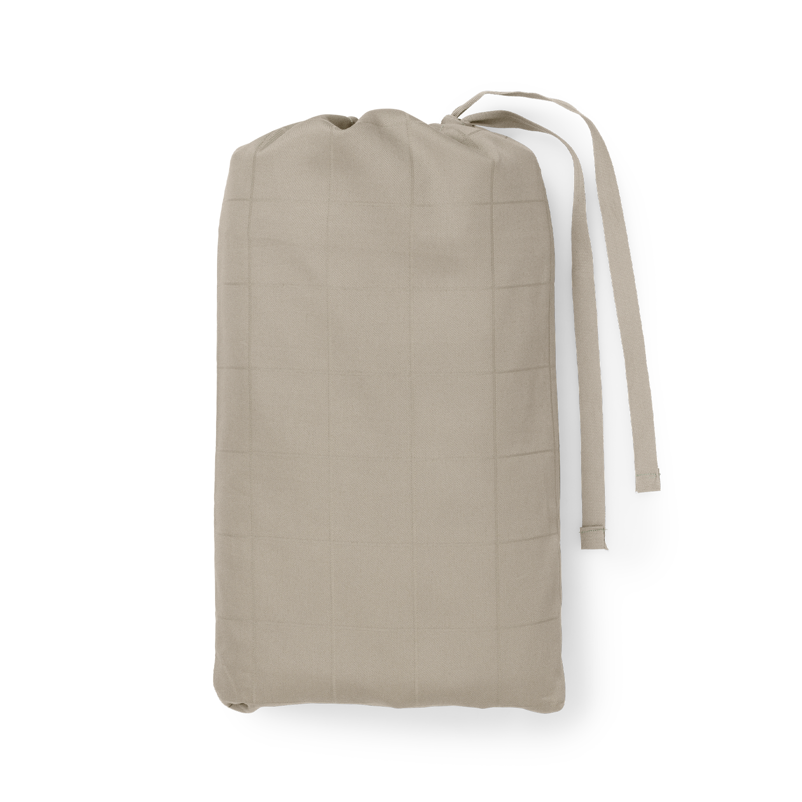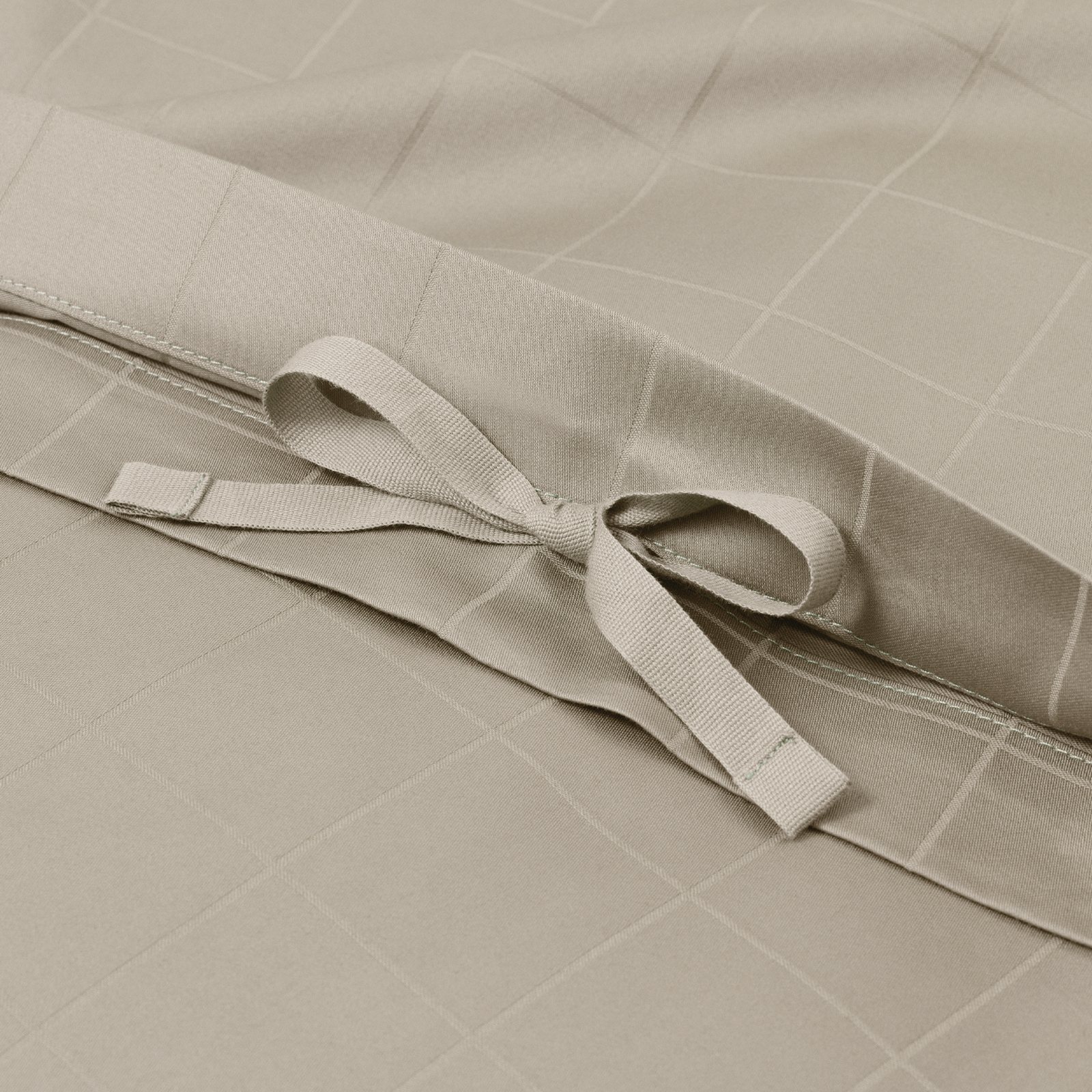 Light Squares bed linen in the colour Grey Sand. Light Squares features a light graphic pattern highlighted by the fine satin weave. It is woven in 100% combed cotton, giving a strong and soft surface. Grey Sand is a warm shade of grey.