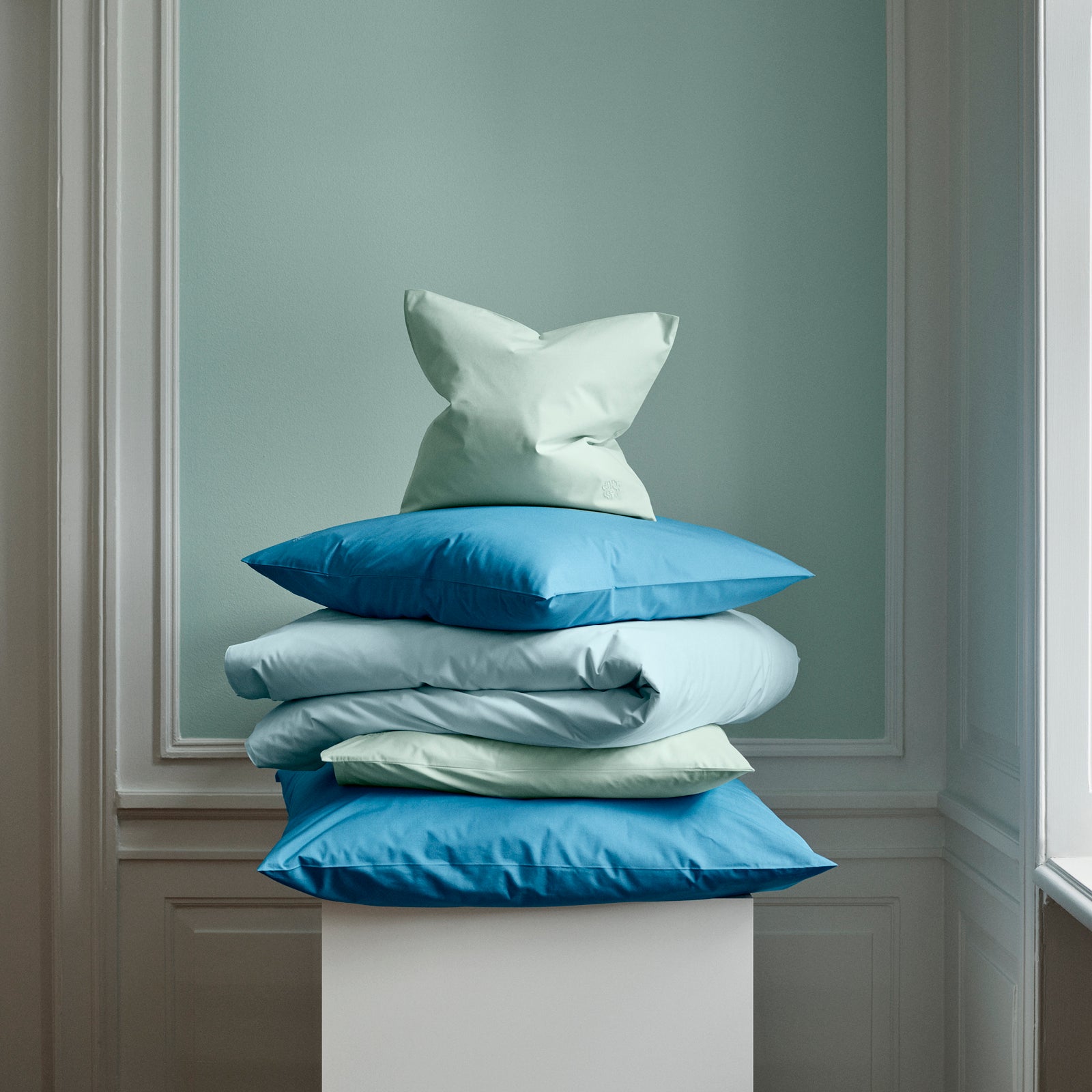 The Supima Percale range includes everything from headboards and pillows to Duvet cover and sheets in colors such as light grey, light green, cool blues and warm earth tones. The long fibers of cotton give the bedding a particularly beautiful and very uniform color tone.
