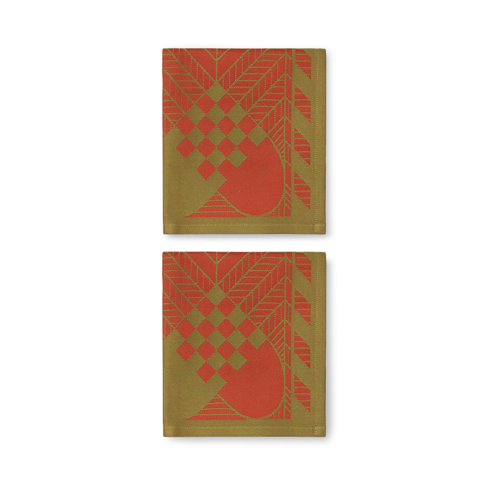 Bodil Bødtker-Næss, who was one the inner-circle of textile designers at Georg Jensen Damask in the 1970s, designed the motif. She was also responsible for the classic Easter design from the same period. The braided Christmas hearts and stylised spruce twigs have represented the quintessence of Christmas atmosphere for more than 40 years and the design is an essential part of Christmas in many Danish homes.