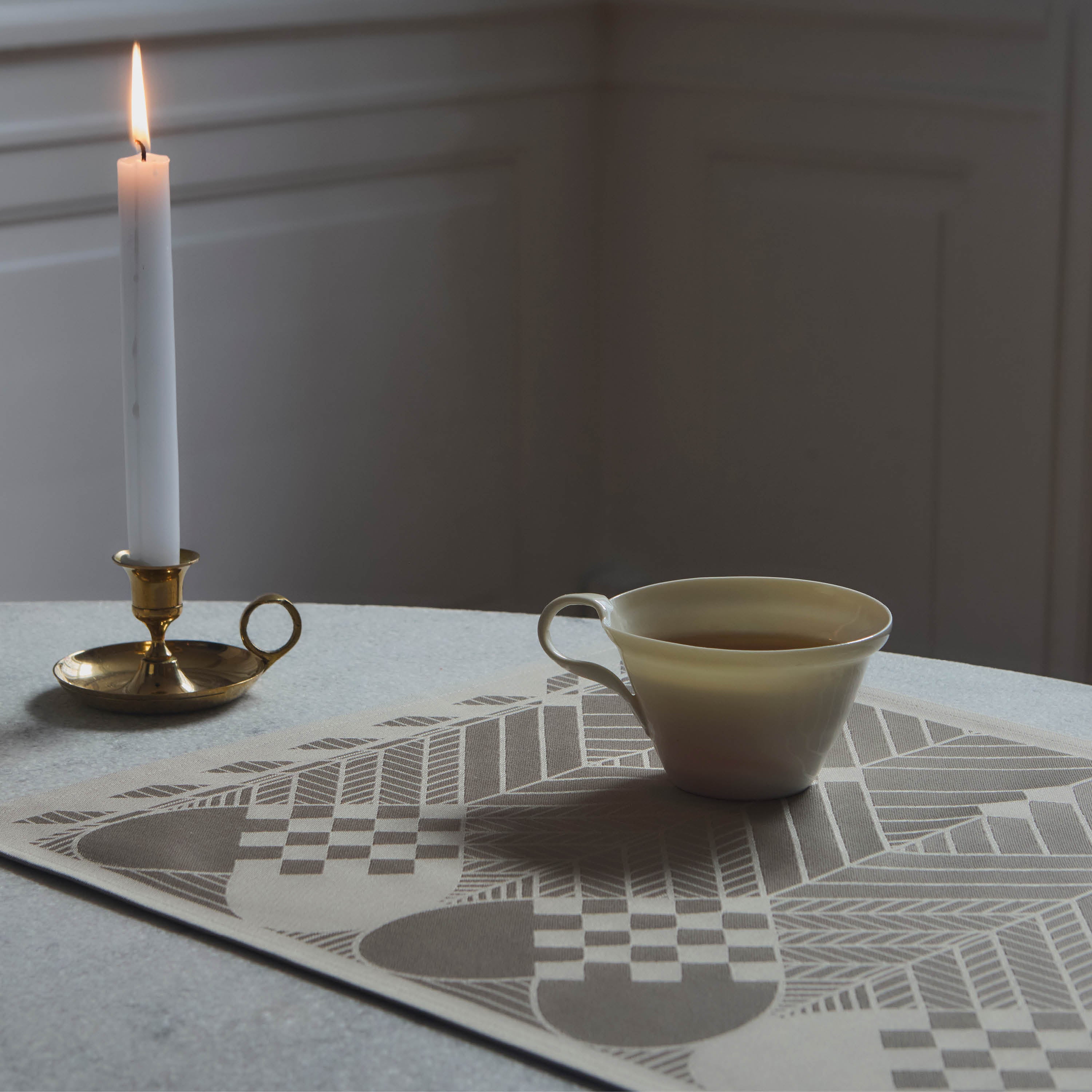 The Christmas place mat features a nostalgic motif with delicate, woven Christmas hearts and stylized fir branches, designed by textile artist Bodil Bødtker-Næss in 1975. This iconic design has become a signature piece in the Georg Jensen Damask collection. Inspired by the smooth, gray-brown bark of old hazel trees, the elegant color of the place mat is named Hazel Wood.