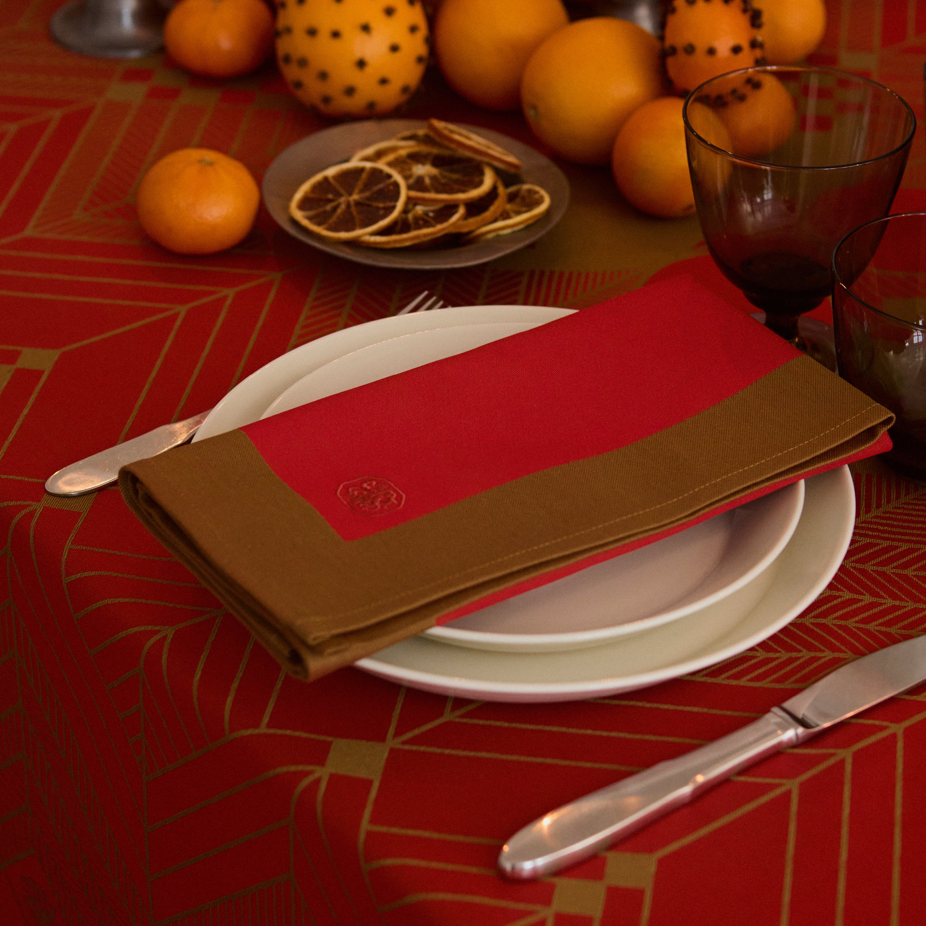 This gorgeous Christmas red napkin allows a meeting of red and gold. The superb damask weaving and the distinctive golden borders give the napkin a beautiful and elegant appearance, no matter how it is folded.