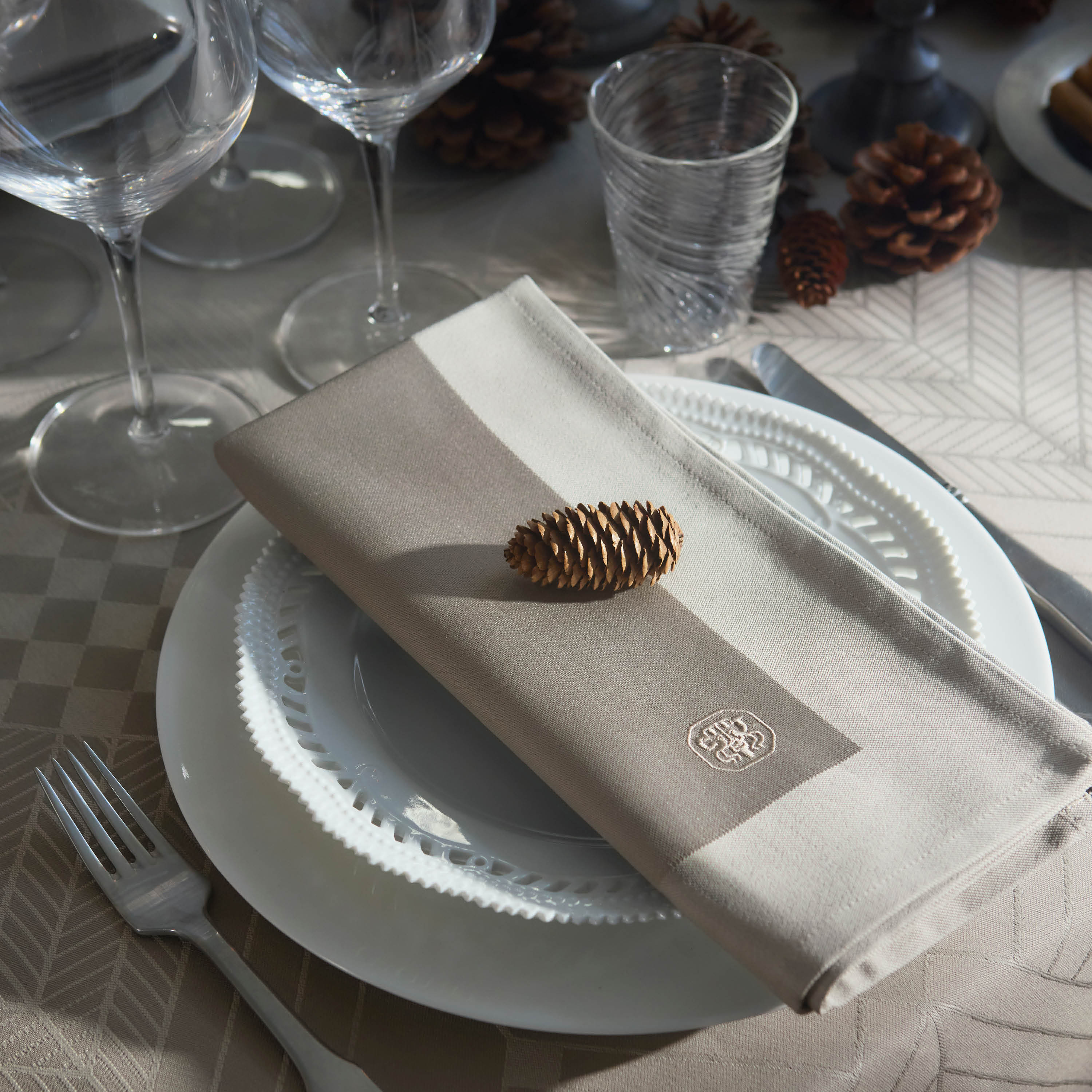 The classic damask-woven napkin adds an elegant touch to the table. Crafted from 100% cotton, the napkin features a finely embroidered logo. Inspired by the smooth, gray-brown bark of old hazel trees, the color of the napkin is aptly named Hazel Wood.