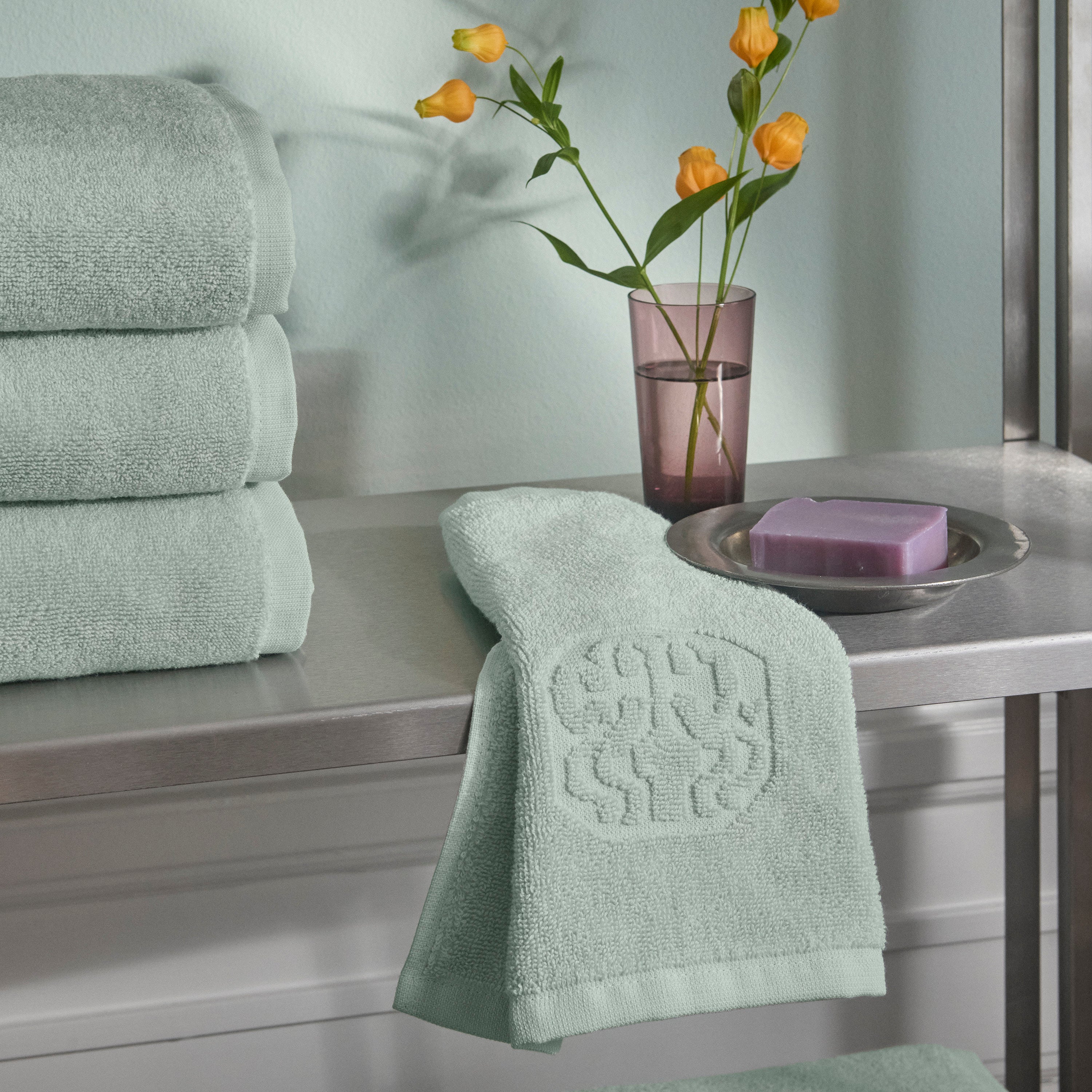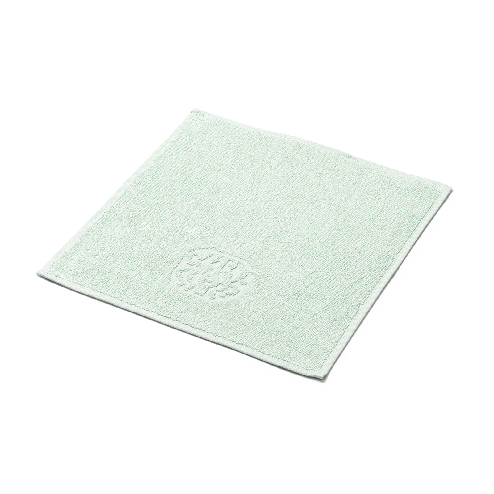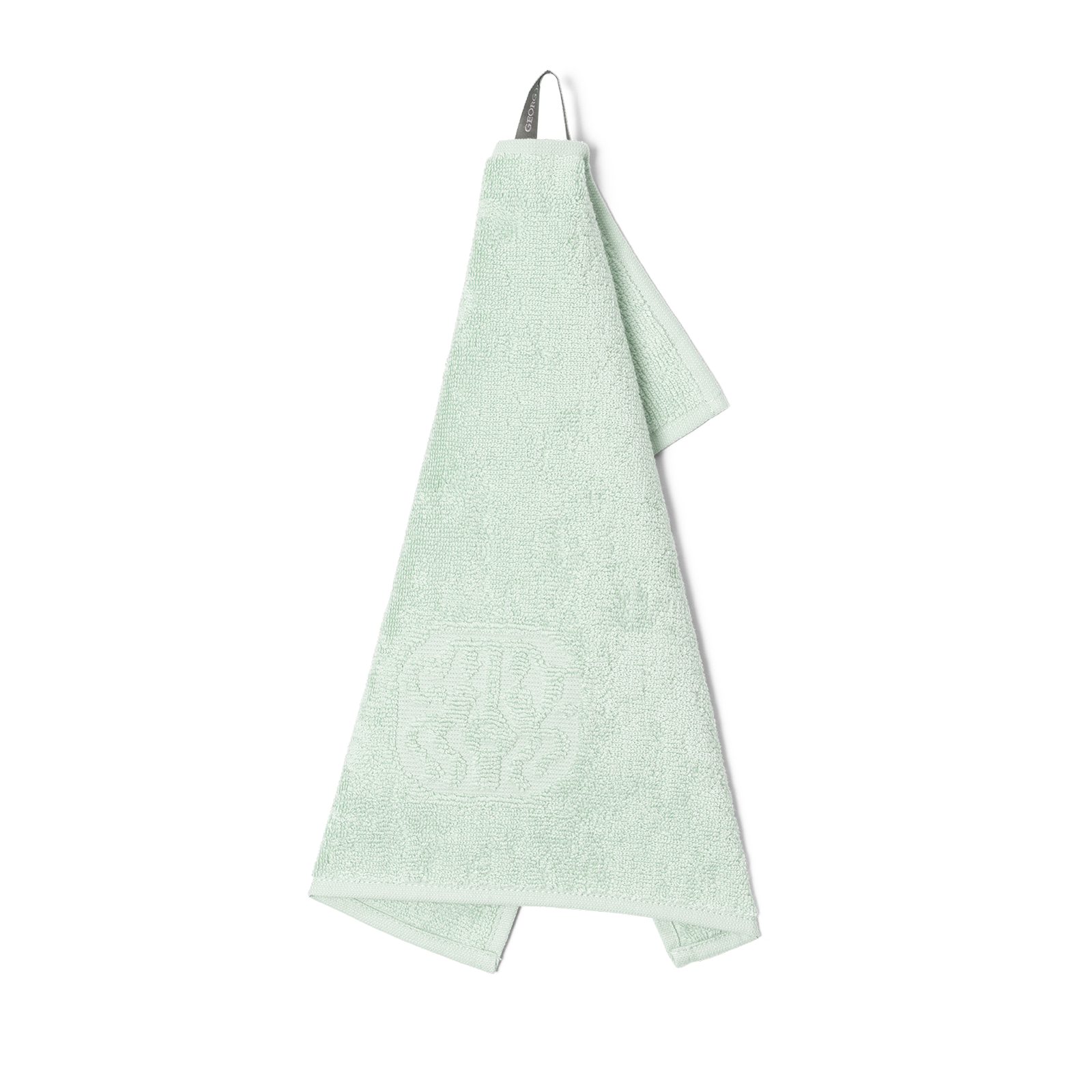 The Damask Terry washcloth has a simple expression with Georg Jensen Damask’s iconic logo woven in as an elegant detail. The clear green-blue shade, Glass Green, is inspired by the colour of raw glass.