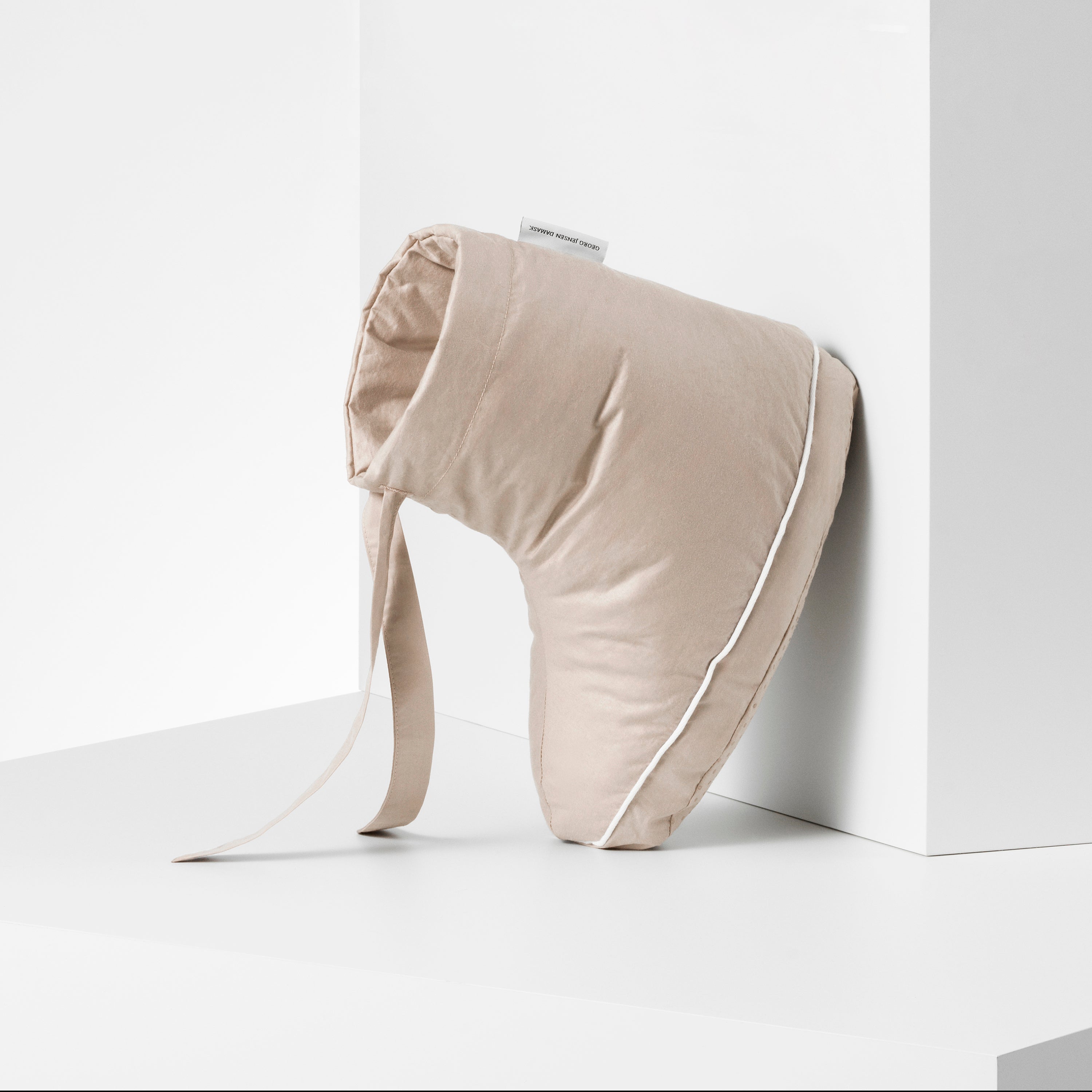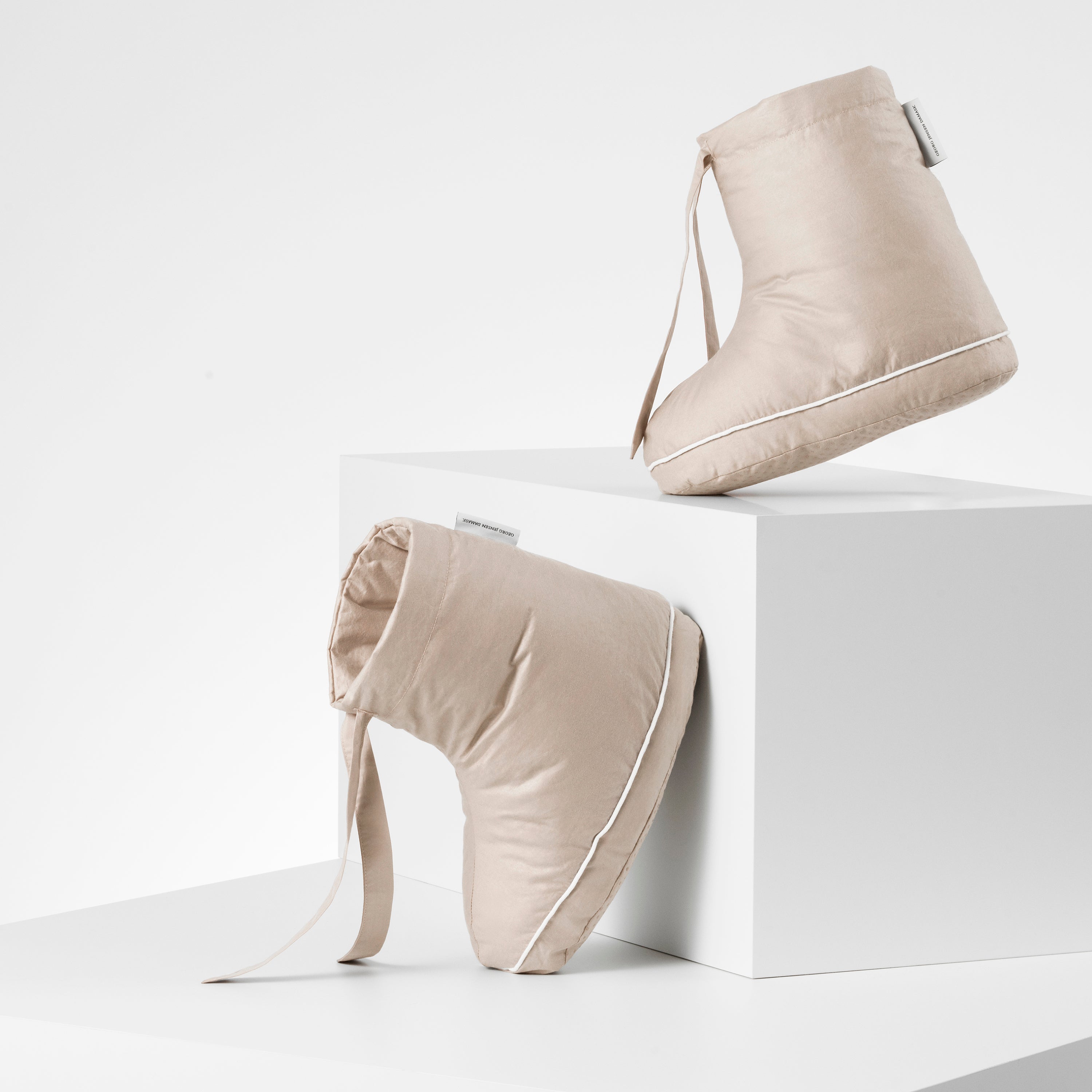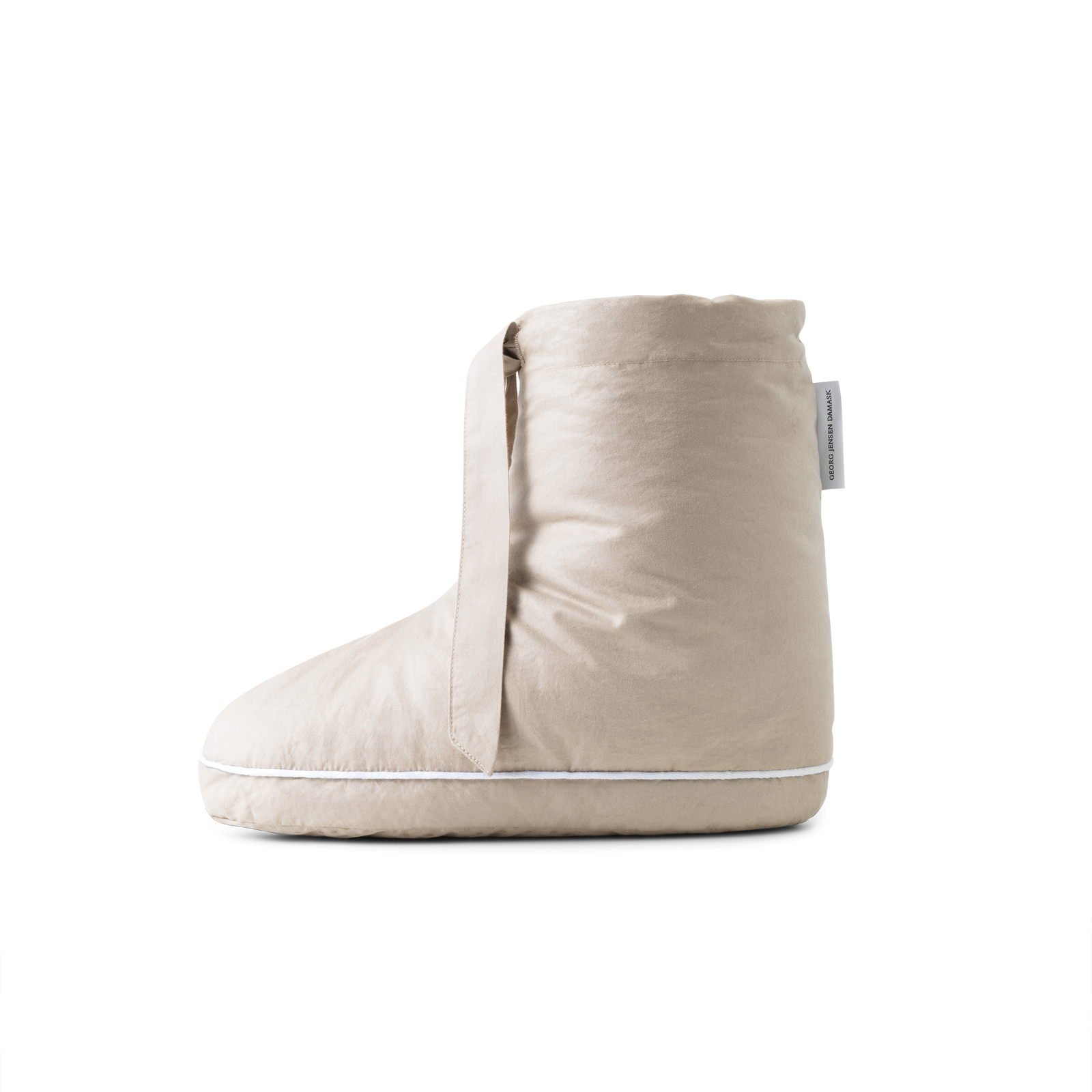 Soft and warm down socks with elegant piping and ankle ties. The Cloud down socks are satin‑woven in 100% cotton and filled with airy, breathable GRS‑certified duck down and feathers. The colour Cashmere is a brown‑toned grey with a calm and exclusive expression.
