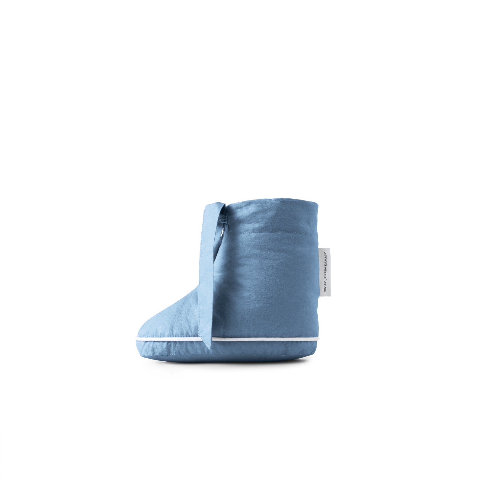 Soft and warm down socks for children with elegant piping and ankle ties. The Cloud down socks are satin‑woven in 100% cotton and filled with airy, breathable GRS‑certified duck down and feathers. Blue Hour is a beautiful and timeless medium blue shade.