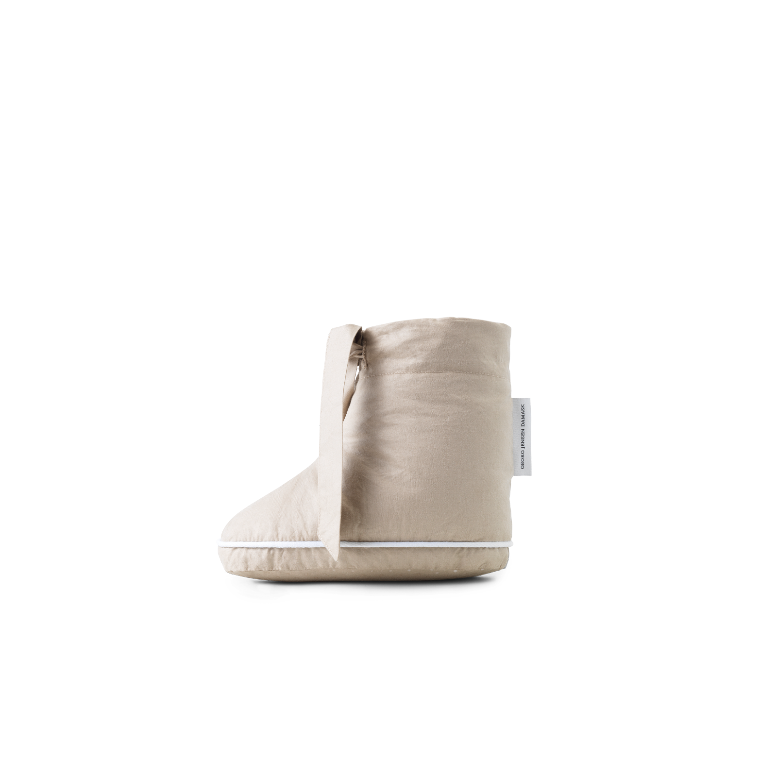 Soft and warm down socks for children with elegant piping and ankle ties. The Cloud down socks are satin‑woven in 100% cotton and filled with airy, breathable GRS‑certified duck down and feathers. The colour Cashmere is a brown‑toned grey with a calm and exclusive expression.
